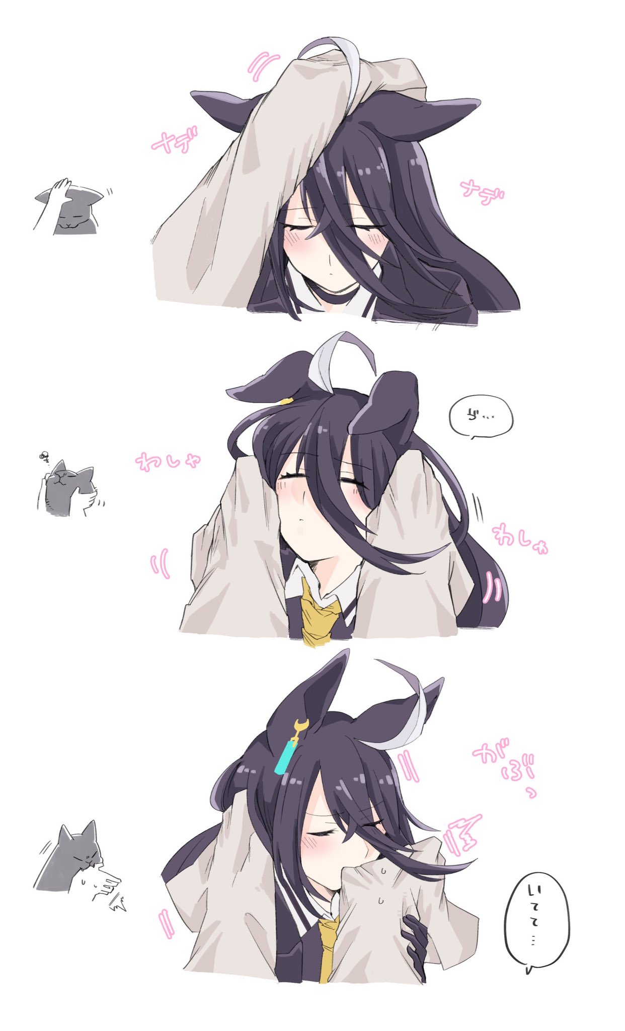 1girl 1other ahoge animal_ears biting black_gloves black_hair blush cat cheek_press closed_eyes closed_mouth earrings ears_down gloves hair_between_eyes headpiece highres horse_ears iwashi_(iwashifurai184) jewelry long_hair long_sleeves manhattan_cafe_(umamusume) motion_lines multiple_views necktie out_of_frame single_earring sleeves_past_fingers sleeves_past_wrists speech_bubble sweatdrop translation_request umamusume yellow_necktie