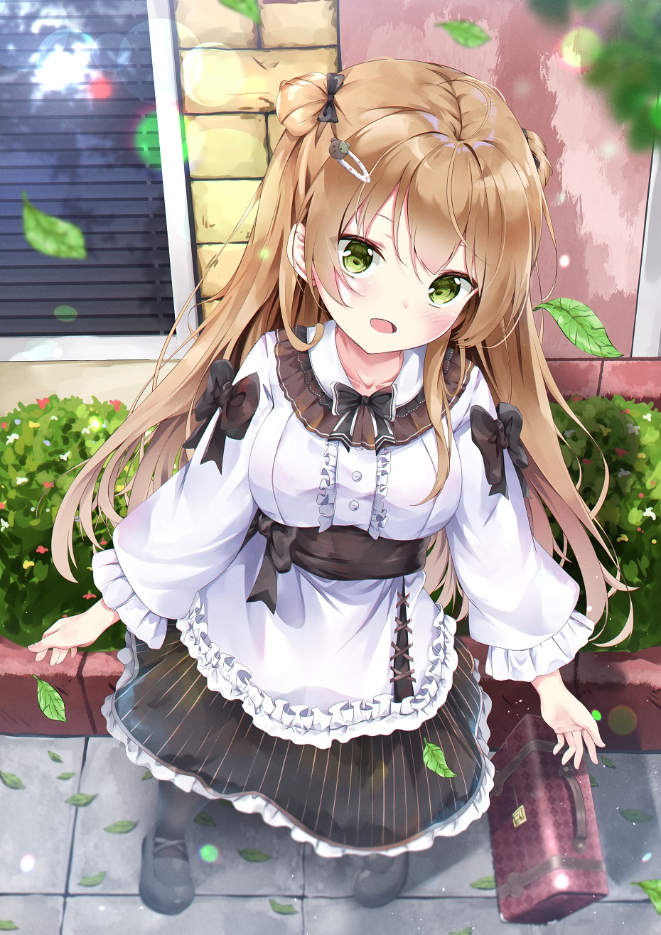 1girl aizawa_(aizawatsu) black_bow black_bowtie black_footwear black_pantyhose bow bowtie brown_hair double_bun dress eyes_visible_through_hair frilled_dress frills girls'_frontline green_eyes hair_bow hair_bun hair_ornament hairclip highres leaf long_hair pantyhose rfb_(girls'_frontline) solo suitcase white_dress