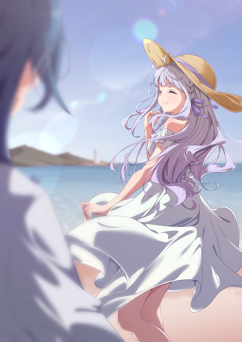 2girls aizawa_kazuha assault_lily bare_shoulders beach blue_hair blue_sky blurry blurry_background blurry_foreground braid brown_headwear closed_eyes commentary_request day depth_of_field dress facing_away feet_out_of_frame floating_hair from_side grey_hair grin hair_ornament hair_ribbon hairclip hand_up hat hat_ribbon highres horizon kon_kanaho lens_flare lighthouse long_hair long_sleeves multiple_girls musihara ocean off-shoulder_dress off_shoulder outdoors parted_lips purple_ribbon ribbon shirt side_braid sidelocks sky sleeveless sleeveless_dress smile solo_focus standing sun_hat sundress wavy_hair white_dress white_shirt
