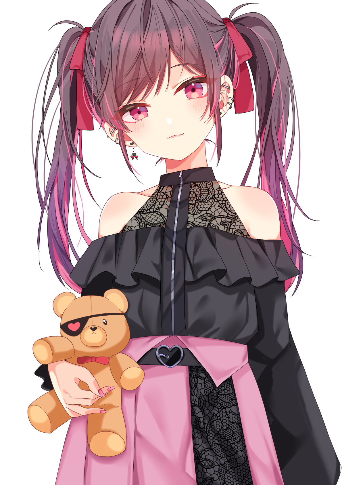 1girl bad_id bad_pixiv_id bare_shoulders earrings eyepatch hair_ornament hanamori_suzu_(hkgbkk8) heart highres jewelry long_hair looking_at_viewer multicolored_hair original pink_eyes red_headwear simple_background solo streaked_hair stuffed_animal stuffed_toy teddy_bear twintails two-tone_hair white_background