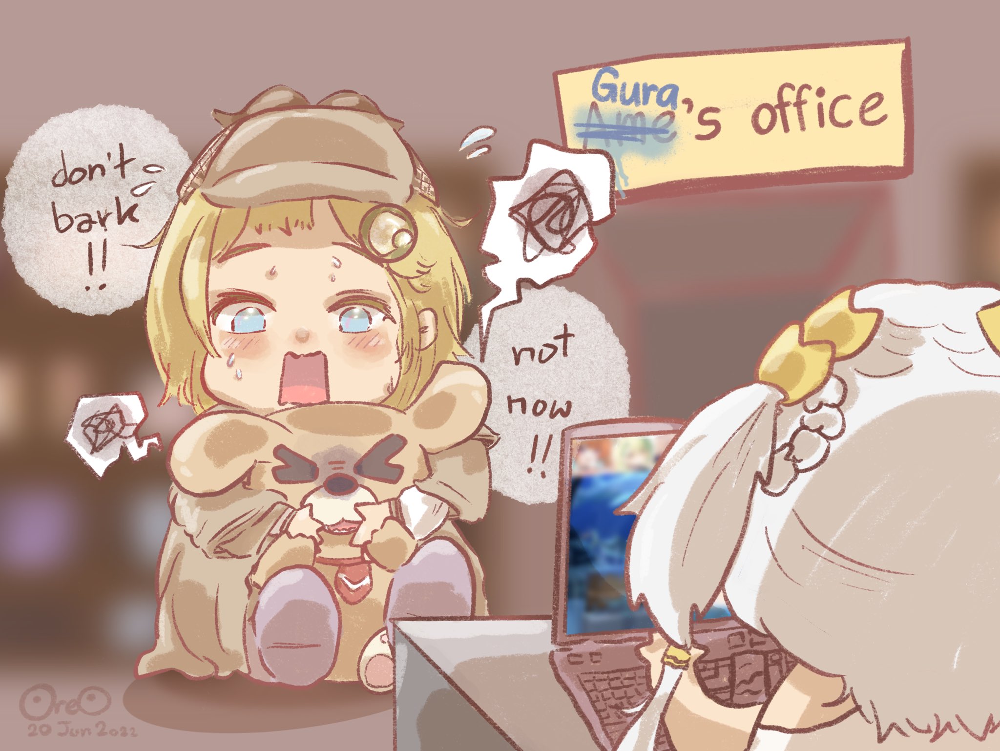 >_< blonde_hair blue_eyes blurry bubba_(watson_amelia) computer d: dog english_text fernroreo gawr_gura hair_ornament hat highres hololive hololive_english jacket laptop open_mouth sign signature speech_bubble toga virtual_youtuber watson_amelia white_hair