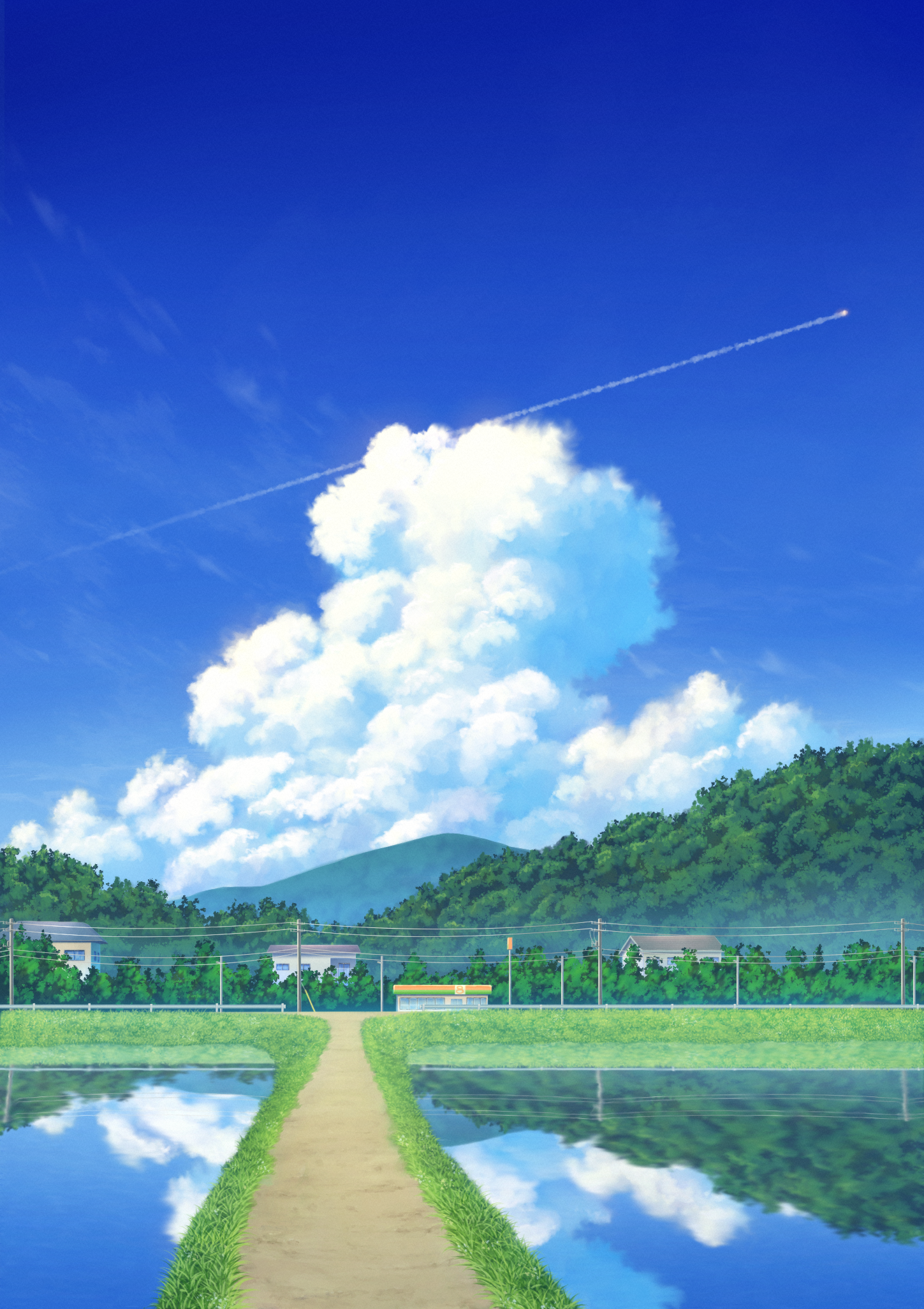 akairyokucha blue_sky cloud contrail convenience_store cumulonimbus_cloud day forest highres house landscape mountain mountainous_horizon nature no_humans original outdoors power_lines railing reflection reflective_liquid rice_paddy road rural scenery shop sky tree utility_pole vanishing_point water