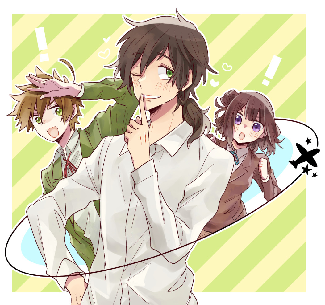 1girl 2boys :o ahoge axis_powers_hetalia breasts brown_hair clenched_hands collared_shirt czech_republic_(hetalia) finger_to_mouth green_eyes medium_breasts multiple_boys one_eye_closed portugal_(hetalia) purple_eyes salute sanitigo shirt slovakia_(hetalia) smile striped_background