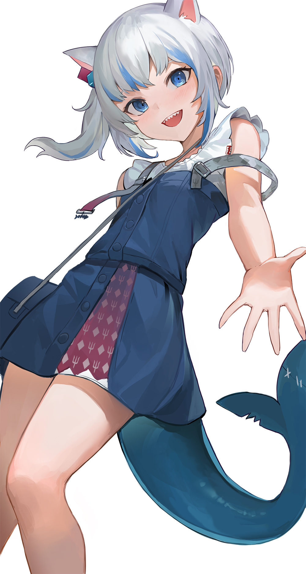 alternate_costume animal_ears bad_id bad_pixiv_id bag blue_eyes blue_hair blunt_bangs casual cat_ears fins fish_tail gawr_gura gawr_gura_(casual) highres hololive hololive_english holomyth looking_at_viewer medium_hair multicolored_hair shark_girl shark_tail sharp_teeth shoulder_bag side_ponytail sl86 streaked_hair tail teeth two_side_up virtual_youtuber white_hair
