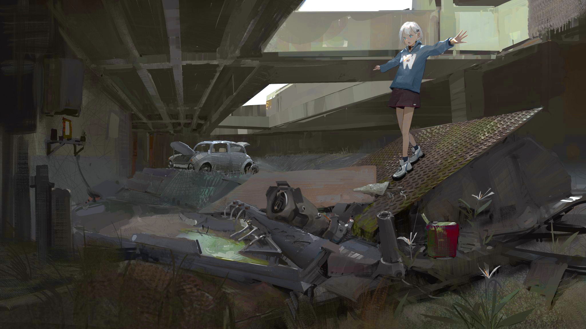 1girl balancing blue_hoodie blue_legwear car gas_can grass hair_ornament hairclip highres hood hoodie motor_vehicle open_mouth original paindude shorts underground weeds white_footwear white_hair wide_shot