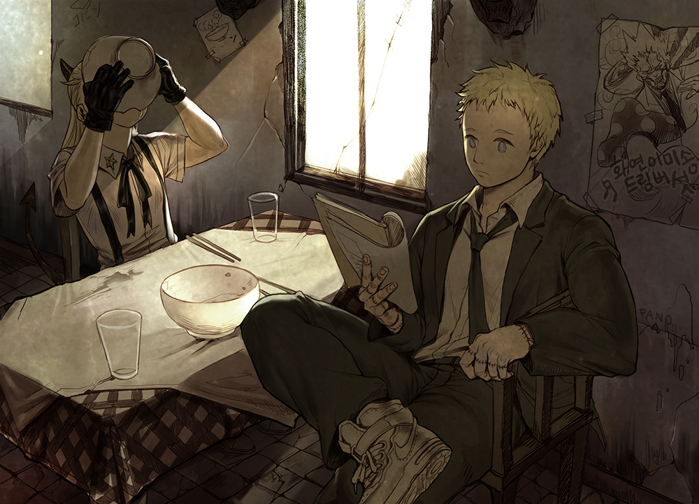 1boy 1girl black_gloves black_jacket black_necktie black_pants blonde_hair blue_eyes book bowl chair chopsticks collared_shirt covered_face crack cracked_glass cracked_wall crossed_legs cup day demon_girl demon_horns demon_tail dorohedoro drinking_glass en_(dorohedoro) english_text formal_clothes gloves grey_hair hands_up holding holding_book holding_bowl horns indoors jacket long_hair long_sleeves necktie noi_(dorohedoro) pano_(pixiv21450527) pants plaid poster_(object) reading red_eyes shin_(dorohedoro) shirt shoes short_hair short_sleeves sitting_sideways stitched_fingers suit suspenders table tablecloth tail tile_floor tiles white_footwear white_shirt window