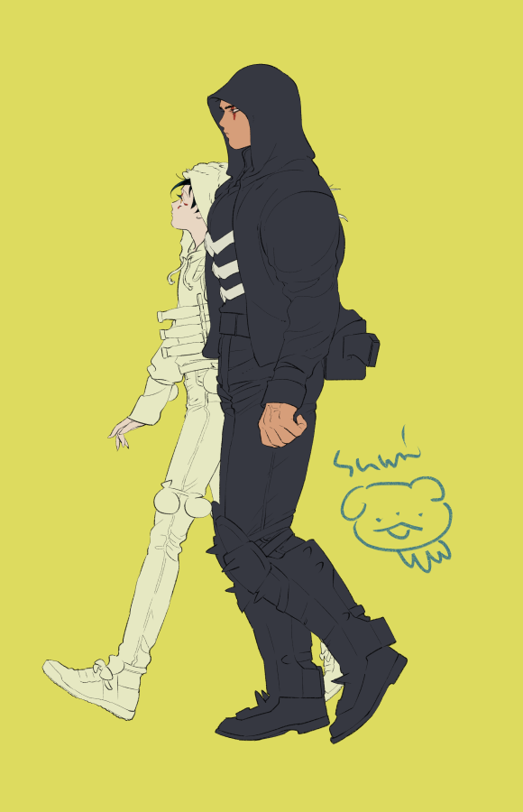 2boys armor black_footwear black_hair black_jacket black_pants dagger dokuga dorohedoro drawstring facial_mark from_side full_body height_difference hood hood_up hoodie jacket kai_(dorohedoro) knee_pads knife long_sleeves looking_away male_focus multiple_boys pants pouch profile shin_guards shoes short_hair sibasumi simple_background walking weapon white_footwear white_hoodie white_pants yellow_background yellow_eyes