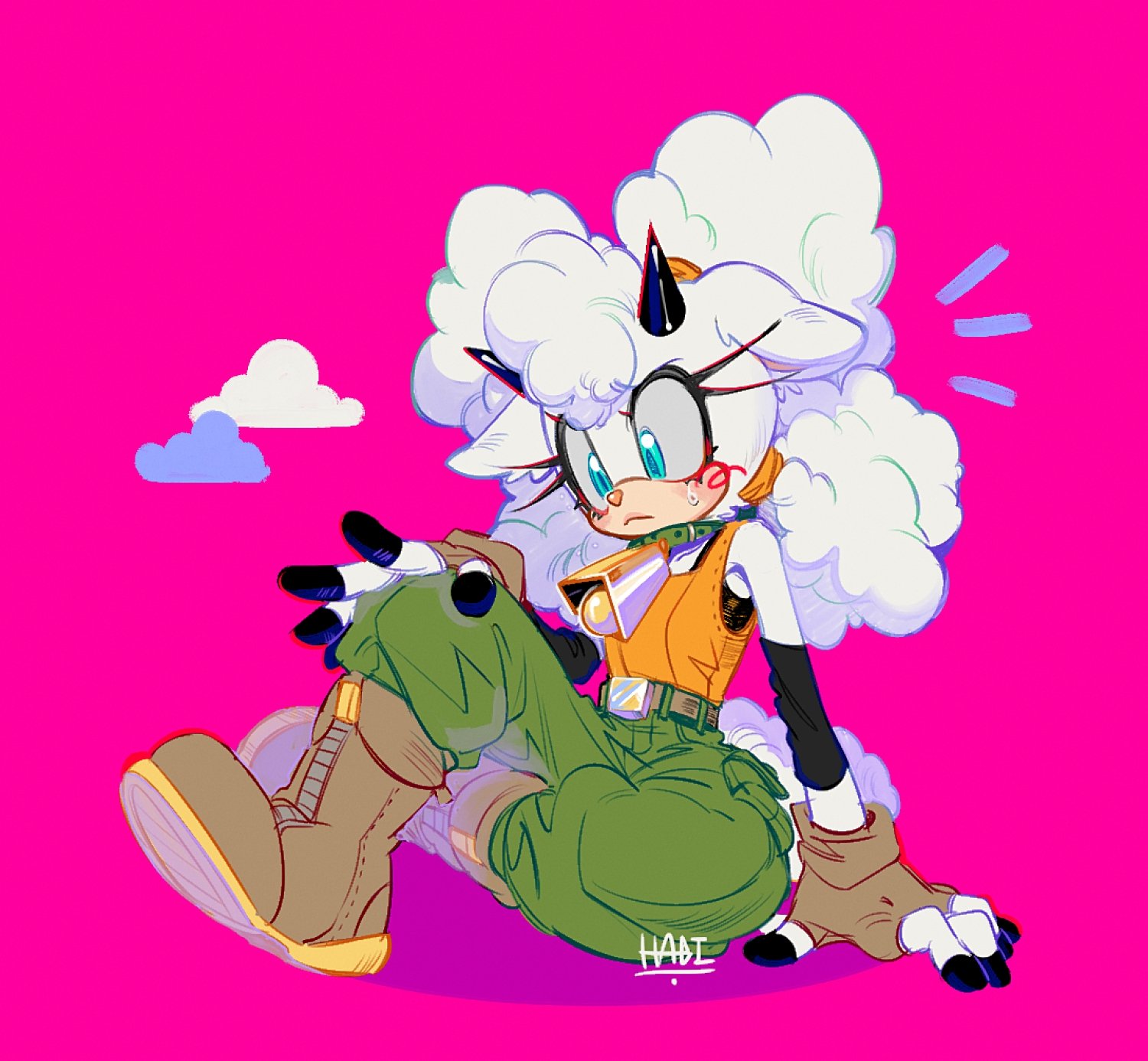 1girl 3mia_hadi3 animal_ears bell blue_eyes boots brown_boots cloud collar commentary cowbell english_commentary fingerless_gloves furry furry_female gloves green_collar green_pants hand_on_own_knee highres horns lanolin_the_sheep long_hair orange_tank_top pants pink_background sheep_ears sheep_girl sitting solo sonic_(series) sonic_the_hedgehog_(idw) tank_top white_hair