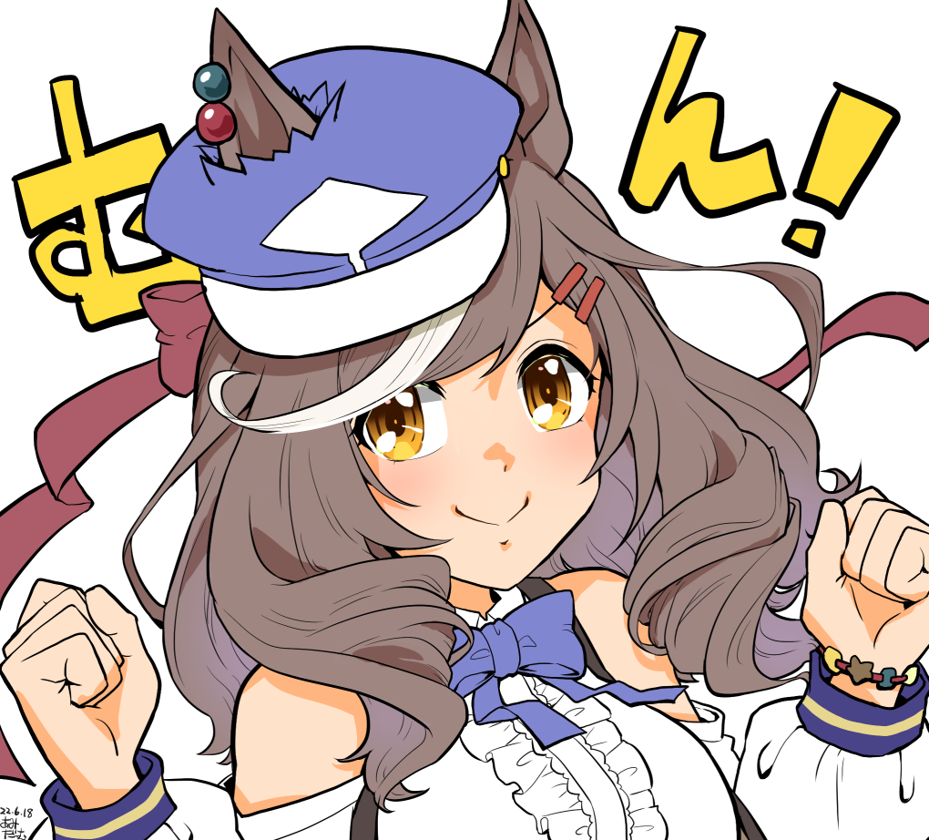 1girl amida_murasaki animal_ears breasts brown_hair clenched_hands commentary_request ei_ei_mun! hair_ornament hairclip hat horse_ears horse_girl looking_at_viewer matikanetannhauser_(clippety-tippety-clop)_(umamusume) matikanetannhauser_(umamusume) medium_breasts medium_hair newsboy_cap portrait ribbon smile solo umamusume