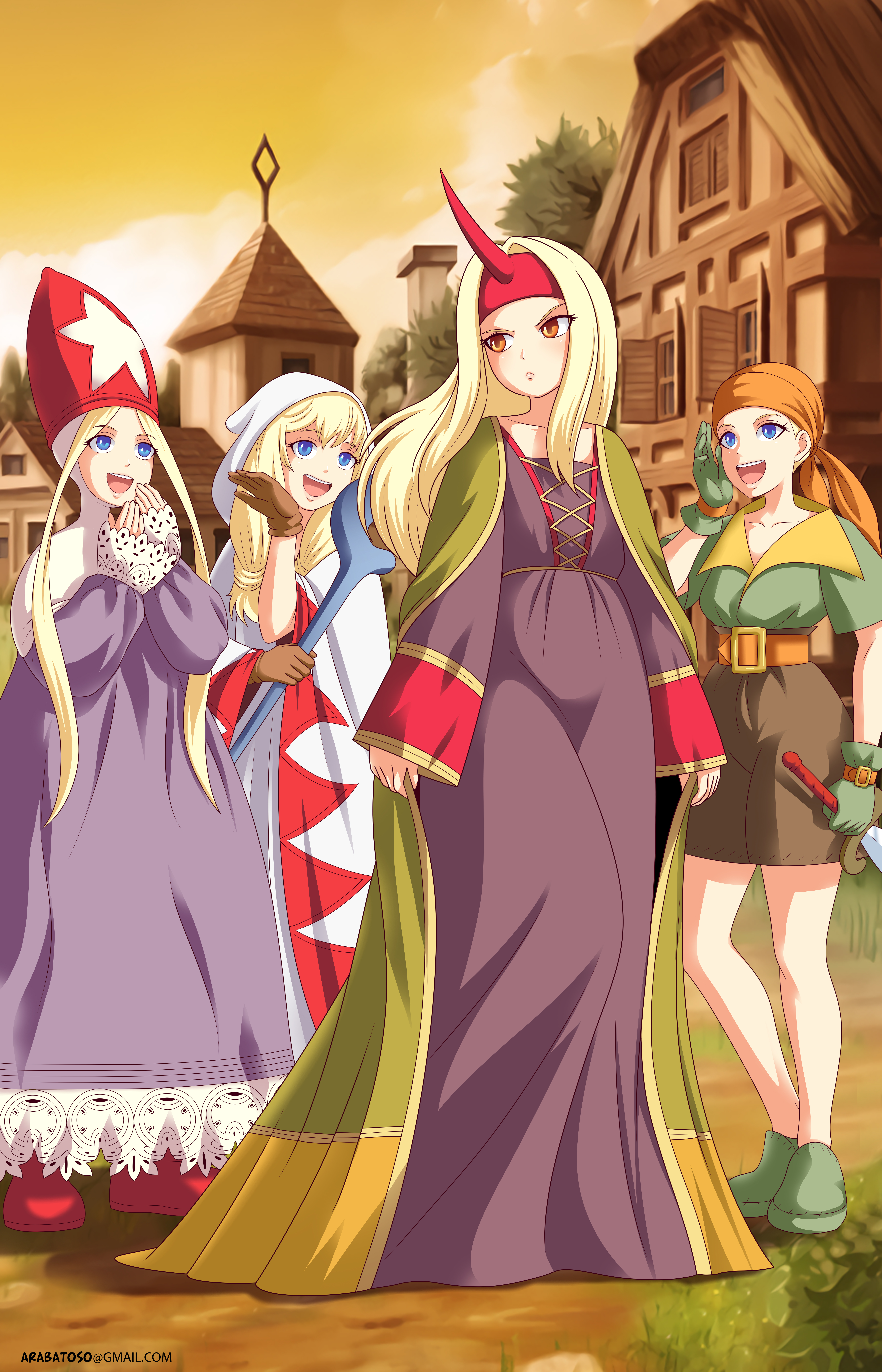 4girls absurdres arabatos bandana belt blonde_hair blue_eyes blush bodice boots buckle building bush cane chimney cloak closed_mouth cloud cloudy_sky commission commissioner_upload dress eyelashes final_fantasy final_fantasy_tactics frilled_dress frills frown game_console gloves grass green_eyes hat highres horn huge_filesize laughing mitre multiple_girls open_mouth path road rooftop scowl shoes shorts sky spire square_enix star_(symbol) summoner_(fft) sword thief_(fft) tiles time_mage time_mage_(fft) tree tunic weapon white_mage white_mage_(fft) white_mage_(final_fantasy) window window_shutter