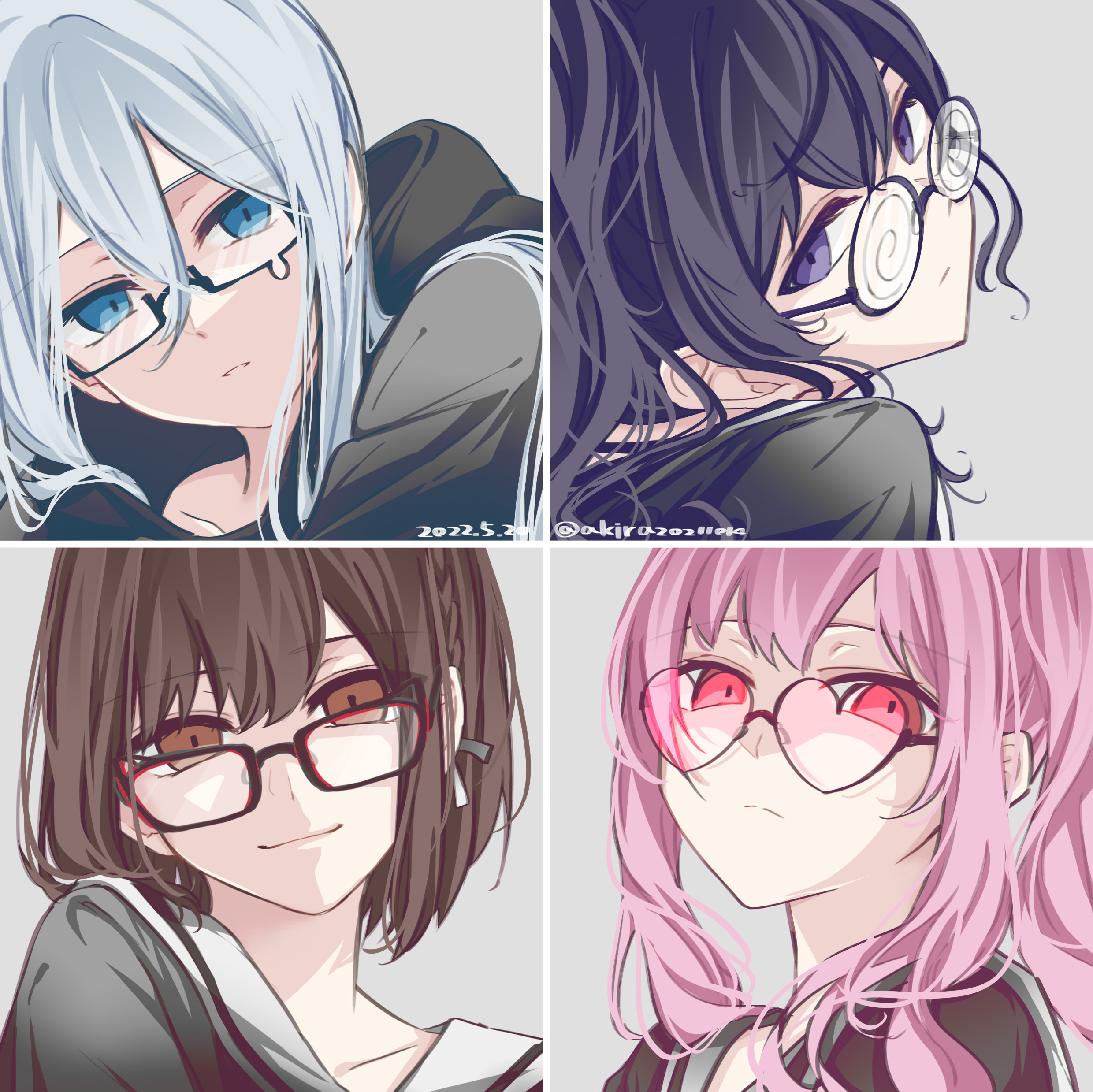 1other 25-ji_nightcord_de._(project_sekai) 3girls absurdres akira20211014 akiyama_mizuki asahina_mafuyu black_shirt blue_eyes blue_hair bow braid brown_eyes brown_hair coke-bottle_glasses column_lineup glasses grid_lineup hair_between_eyes hair_bow heart heart-shaped_eyewear highres multiple_girls pink-framed_eyewear pink_eyes pink_hair project_sekai purple_eyes purple_hair rectangular_eyewear round_eyewear sailor_collar school_uniform serafuku shinonome_ena shirt short_hair teardrop-framed_glasses white_bow white_sailor_collar yoisaki_kanade