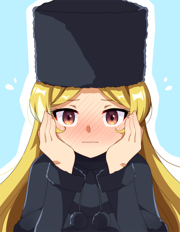 1girl black_cape black_hat blonde_hair blush brown_eyes cape cosplay drawstring full-face_blush fur_hat fur_trim hako_(shimaaka_box) hands_on_own_cheeks hands_on_own_face hat long_hair looking_at_viewer maetel maetel_(cosplay) parted_bangs portrait shinkalion_(series) shinkansen_henkei_robo_shinkalion shinkansen_henkei_robo_shinkalion_z solo tsukino_maetel ushanka