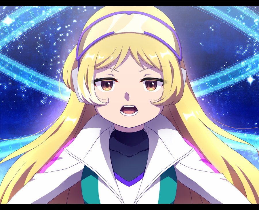 1girl blonde_hair bodysuit collarbone hako_(shimaaka_box) headphones jacket letterboxed long_hair open_mouth pilot_suit portrait shinkalion_(series) shinkansen_henkei_robo_shinkalion shinkansen_henkei_robo_shinkalion_z solo tsukino_maetel v-shaped_eyebrows white_jacket