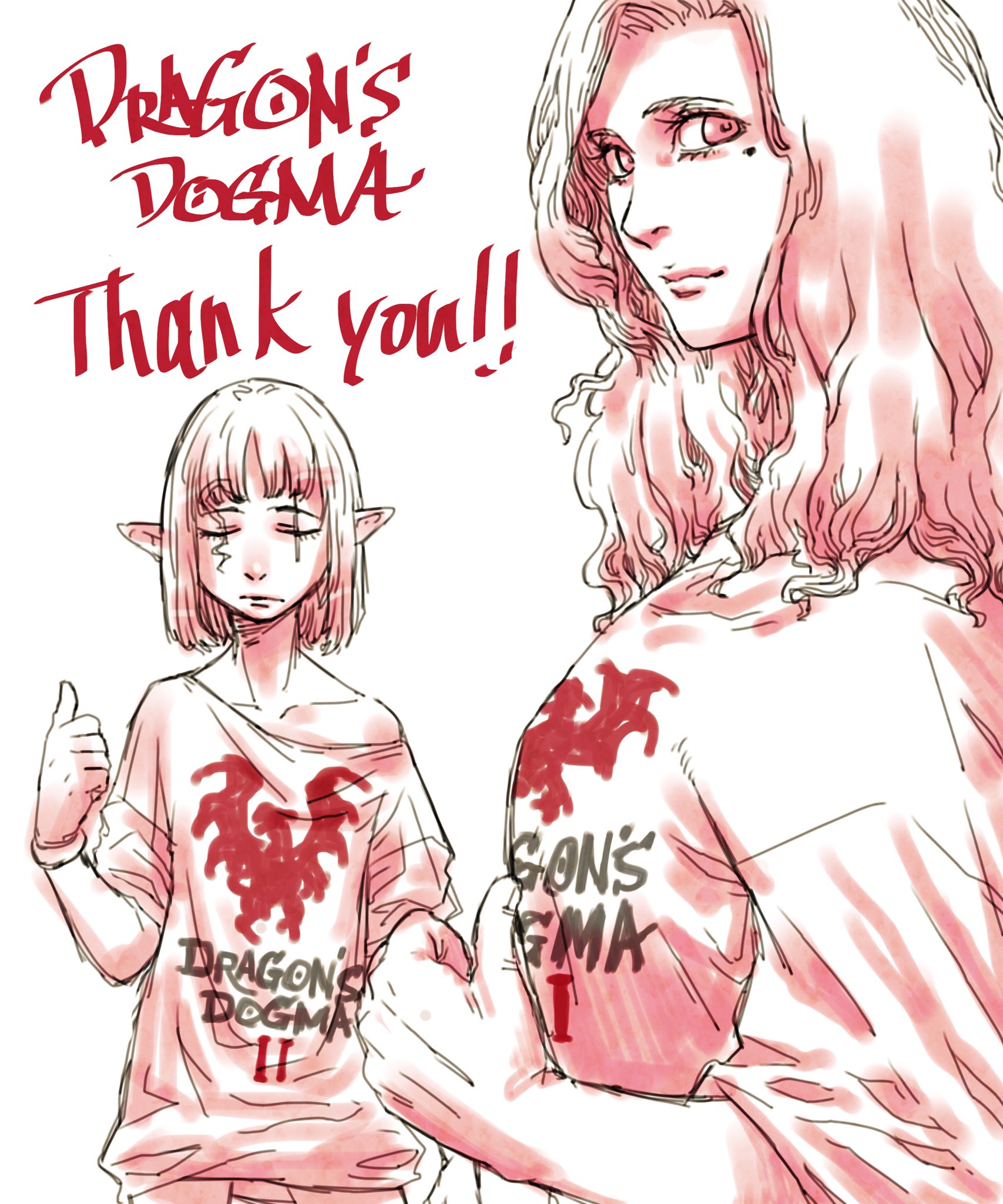 2girls arisen_(dragon's_dogma) closed_eyes closed_mouth clothes_writing collarbone copyright_name dragon's_dogma dragon's_dogma_(series) english_text highres long_hair mole mole_under_eye multiple_girls off-shoulder_shirt off_shoulder oversized_clothes oversized_shirt pawn_(dragon's_dogma) pointy_ears scar scar_across_eye scar_on_face shirt short_hair simple_background single_bare_shoulder t-shirt thumbs_up white_background yuki_(asdfgh)