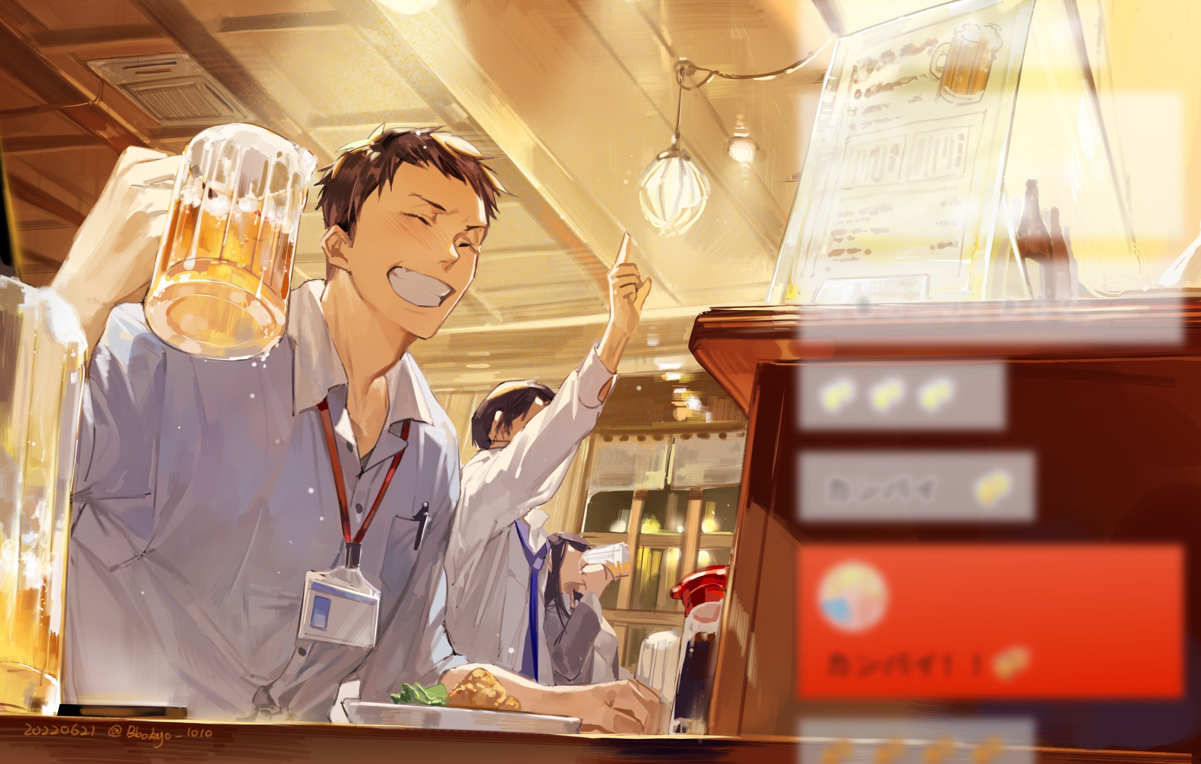 1girl 2boys adam's_apple alcohol arm_up beer beer_mug black_hair blazer blurry blurry_foreground blush bokyo bottle breast_pocket brown_hair closed_eyes collared_shirt cup dated dated_commentary depth_of_field drinking drunk foam food foreshortening fried_food from_below grey_jacket hand_up highres holding holding_cup id_card index_finger_raised indoors jacket lanyard long_hair menu mug multiple_boys necktie original partially_unbuttoned pen plate pocket purple_necktie restaurant salaryman shirt short_hair shrimp shrimp_tempura slice_of_life smile soy_sauce suit_jacket teeth tempura twitter_username very_short_hair virtual_youtuber white_shirt