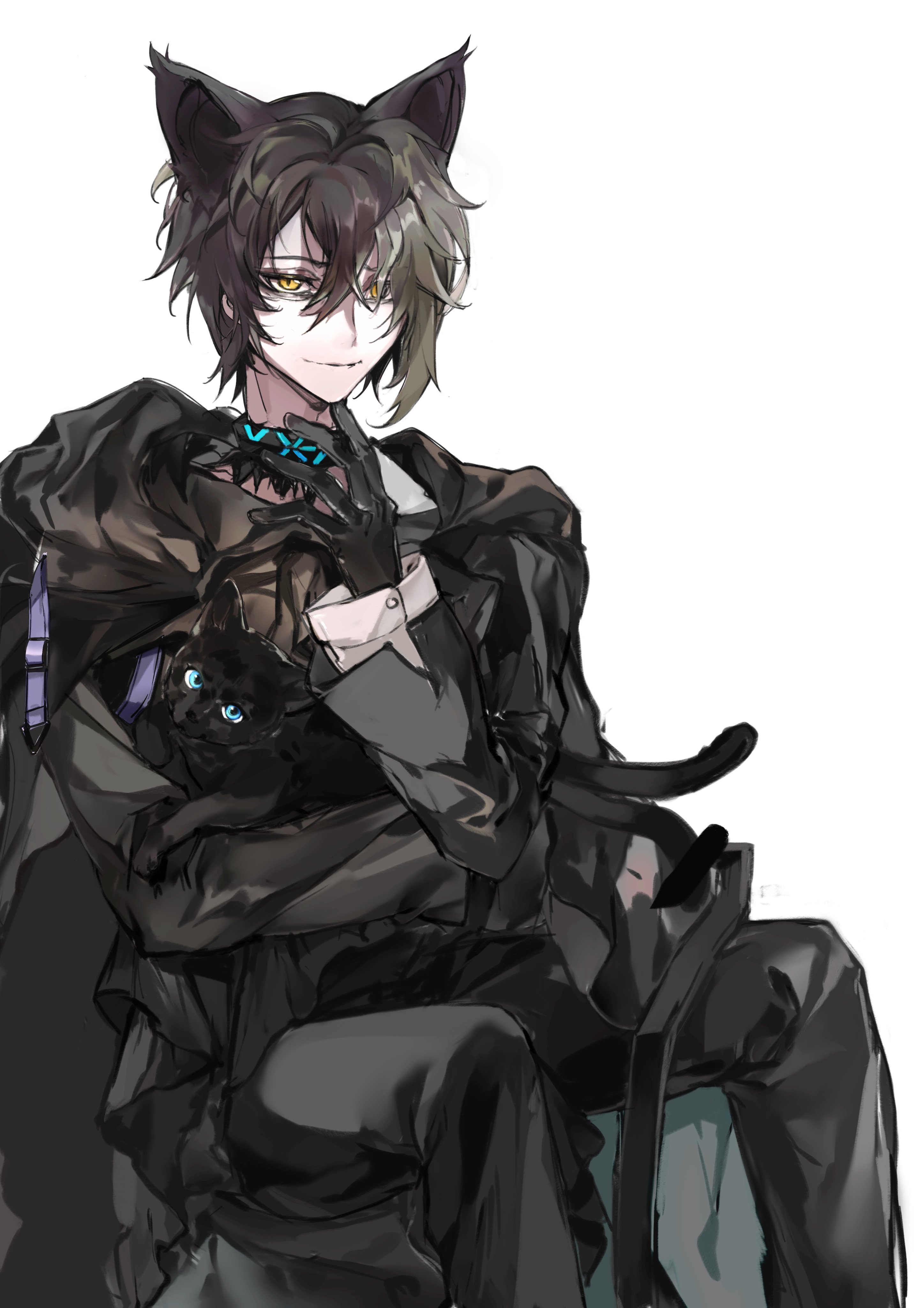 1boy absurdres animal animal_ears arknights black_cat black_cloak black_gloves black_hair black_jacket black_pants blue_eyes cat cat_boy cat_ears cat_tail cloak closed_mouth collar gloves hair_between_eyes hair_over_one_eye hand_on_own_face highres holding holding_animal holding_cat jacket lay92378283 looking_at_viewer pants phantom_(arknights) shirt short_hair sitting smile tail upper_body white_background white_shirt yellow_eyes