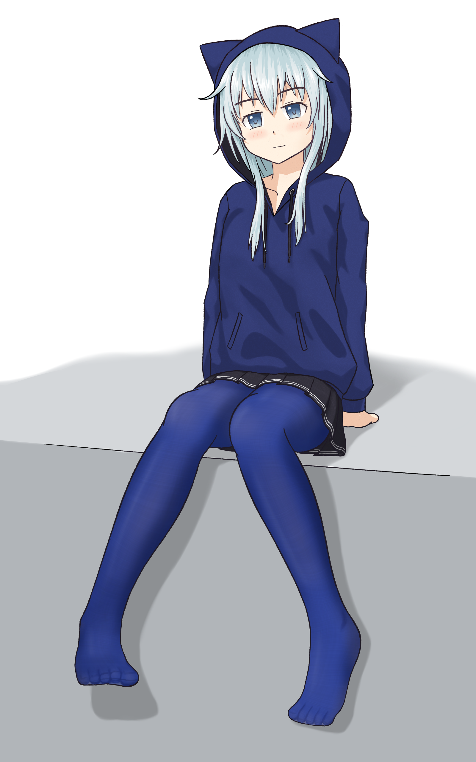1girl absurdres animal_ears animal_hood arms_behind_back black_skirt blue_eyes blue_hair blue_hoodie blue_legwear cat_ears cat_hood feet hibiki_(kancolle) highres hood hoodie ichigoinsoul ichigonosei kantai_collection light_blue_hair see-through_clothes see-through_legwear simple_background sitting skirt smile toes