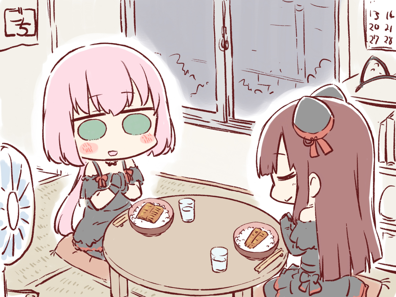 2girls animal_ears artist_name assault_lily bare_shoulders black_dress black_gloves black_legwear blunt_ends blush book bowl brown_hair calendar_(object) cat_ears chibi chopstick_rest chopsticks closed_eyes closed_mouth commentary_request cup cushion dress drinking_glass elbow_gloves electric_fan fake_animal_ears fish_(food) food gloves gochisousama_(tanin050) gozen_(assault_lily) green_eyes grilled_eel hairband hairpods hands_up indoors kabayaki long_hair looking_at_food low_ponytail multiple_girls no_pupils off-shoulder_dress off_shoulder on_floor outline own_hands_together palms_together pantyhose parted_lips pink_hair ponytail praying profile rice seiza shelf short_sleeves sidelocks sitting smile table tatami toda_eulalia_kotohi unadon_(food) unworn_hairband water white_outline window