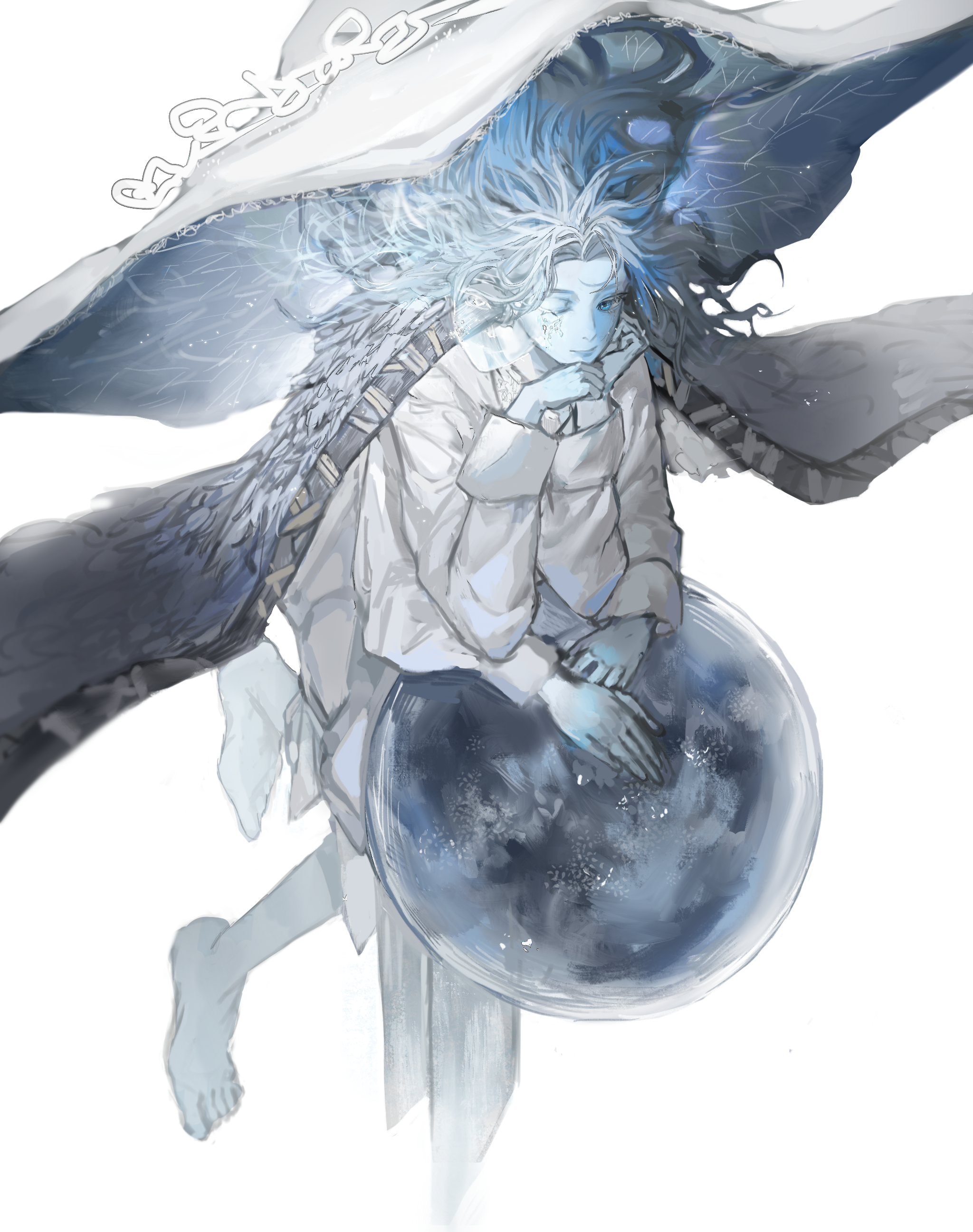 1girl absurdres barefoot blue_eyes blue_hair blue_skin cloak colored_skin commentary dress elbow_rest elden_ring extra_arms extra_faces floating_hair full_body fur_cloak hat head_on_hand head_rest highres leaning_on_object long_sleeves looking_to_the_side niutoutou one_eye_closed planet ranni_the_witch short_hair simple_background smile solo wavy_hair white_background white_dress witch_hat