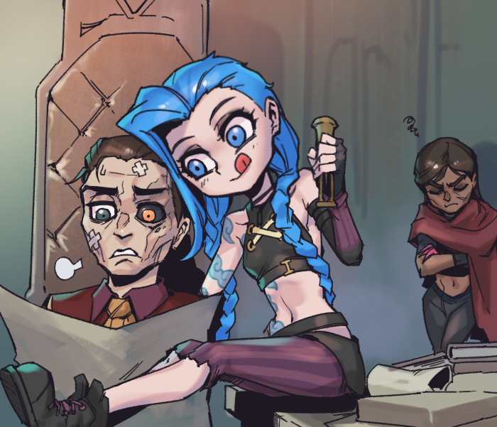 1boy 2girls :q arcane:_league_of_legends arcane_jinx arm_tattoo bandaid bandaid_on_face bare_shoulders belt black_sclera blue_eyes blush braid breasts brown_belt brown_footwear brown_hair brown_shirt cloud_tattoo collared_shirt colored_sclera dark-skinned_female dark_skin father_and_child father_and_daughter holding jinx_(league_of_legends) league_of_legends long_hair multiple_girls navel necktie orange_necktie pants parent_and_child phantom_ix_row pink_pants red_shirt sevika_(arcane) shirt shoes silco_(arcane) small_breasts smile squiggle stomach striped_clothes striped_pants tattoo tongue tongue_out twin_braids twintails