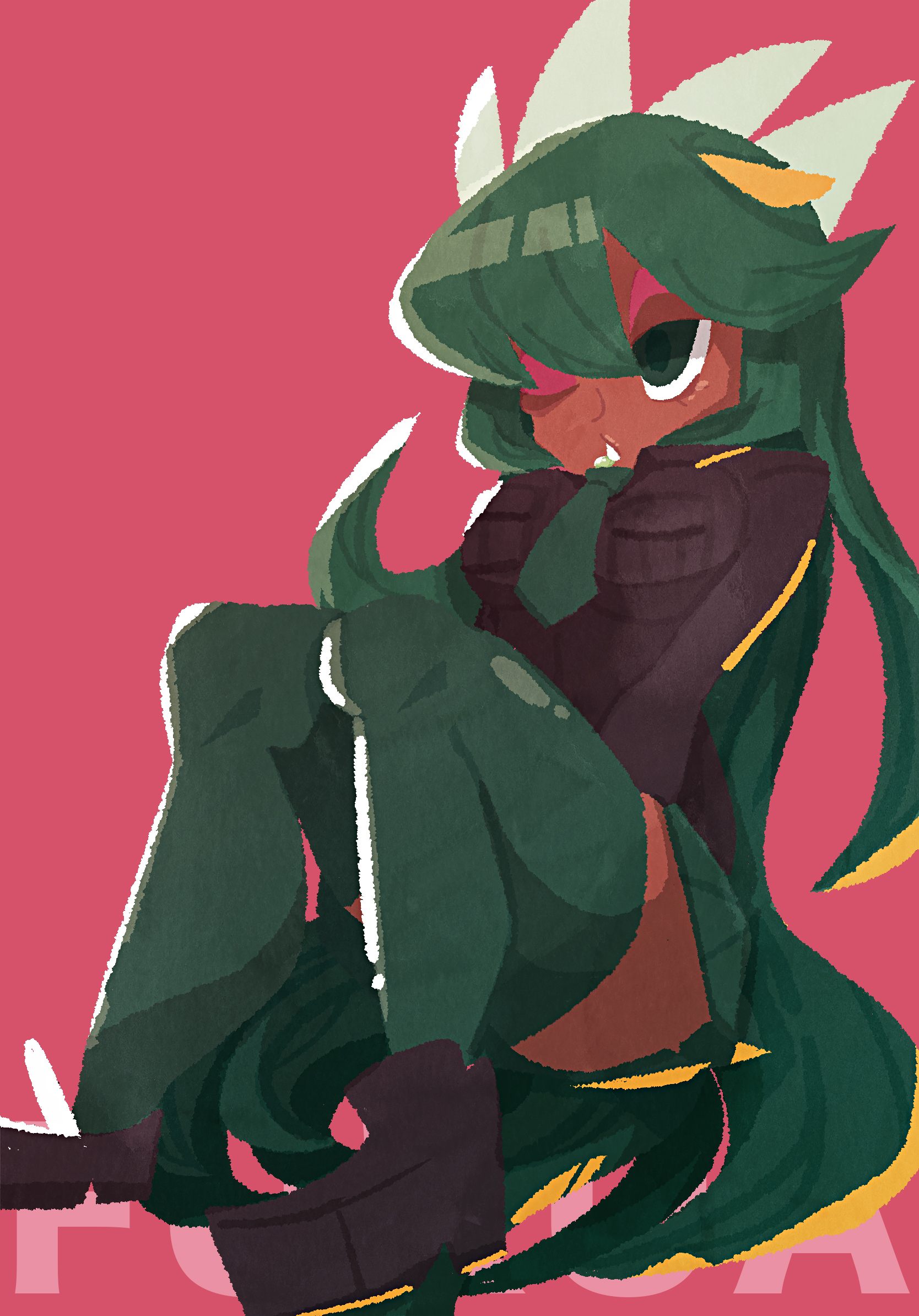 1girl character_name dark-skinned_female dark_skin eyeshadow fukua_(skullgirls) green_hair green_lips highres long_hair makeup necktie one_eye_closed pink_background pleated_skirt school_uniform shamone_(skullgirls) skirt skullgirls solo thighhighs zettonamo888