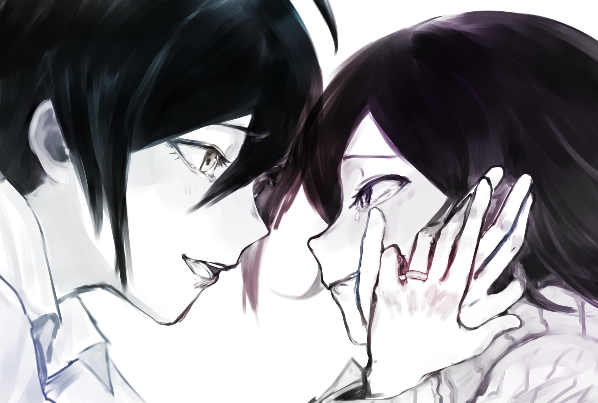 2boys black_hair brown_eyes closed_mouth collared_shirt danganronpa_(series) danganronpa_v3:_killing_harmony eye_contact hair_between_eyes hands_up highres jewelry looking_at_another male_focus mimi_(mimionee) multiple_boys no_jacket open_mouth oma_kokichi profile purple_eyes ring saihara_shuichi shirt short_hair tears teeth