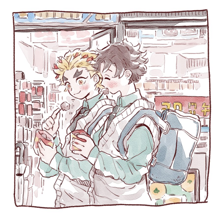 2boys ^_^ bag black_hair black_necktie blonde_hair blue_shirt blush border closed_eyes eating closed_eyes fast_food food forked_eyebrows from_side hands_up holding holding_food kamado_sumihiko kimetsu_no_yaiba long_sleeves male_focus multicolored_eyes multicolored_hair multiple_boys necktie oshioo_o red_eyes red_hair rengoku_toujurou school_bag school_uniform shirt side-by-side storefront streaked_hair sweater_vest upper_body yellow_eyes