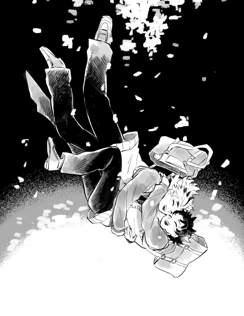 2boys ^_^ bag closed_eyes closed_eyes falling forked_eyebrows full_body greyscale happy hug kamado_sumihiko kimetsu_no_yaiba long_sleeves male_focus monochrome multicolored_hair multiple_boys necktie oshioo_o pants petals rengoku_toujurou school_bag school_uniform shoes simple_background streaked_hair sweater_vest