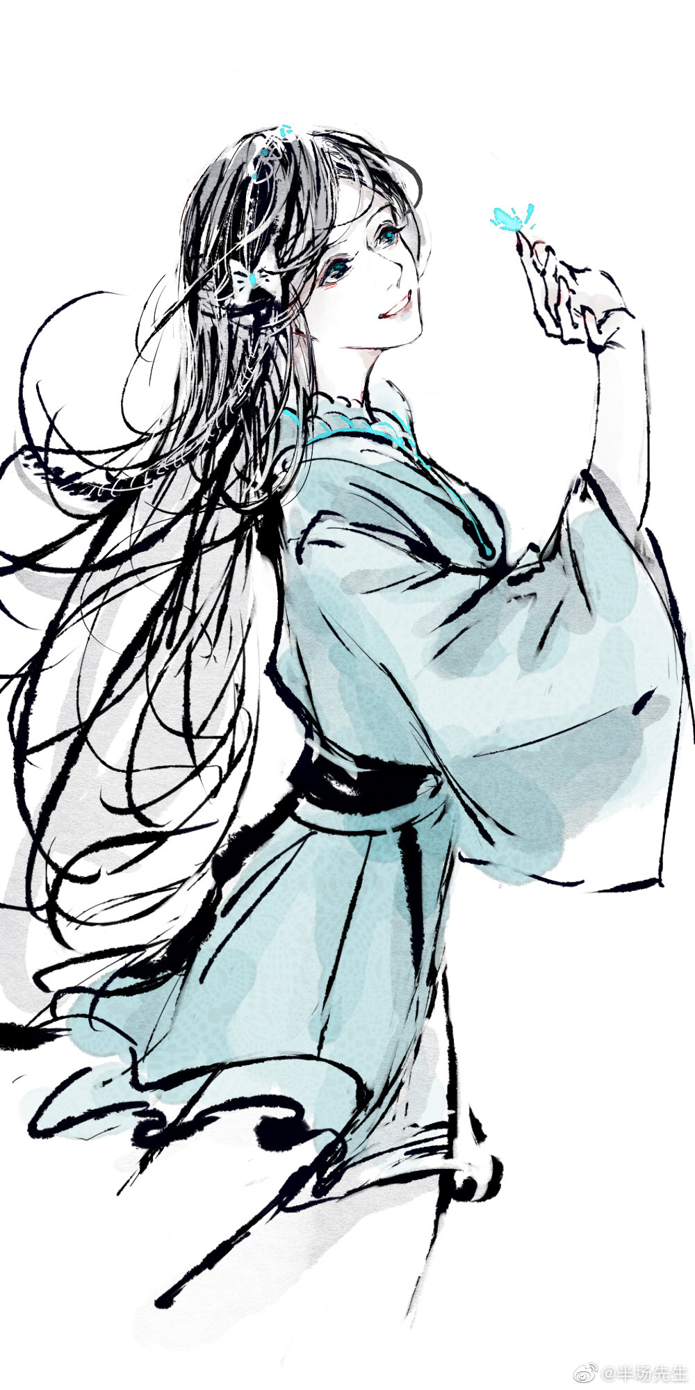 1girl banchang_xiansheng black_hair braid bug butterfly douluo_dalu dress green_dress hair_strand highres ink_(medium) insect long_hair long_sleeves looking_up ning_rongrong_(douluo_dalu) open_mouth smile teeth traditional_media white_background