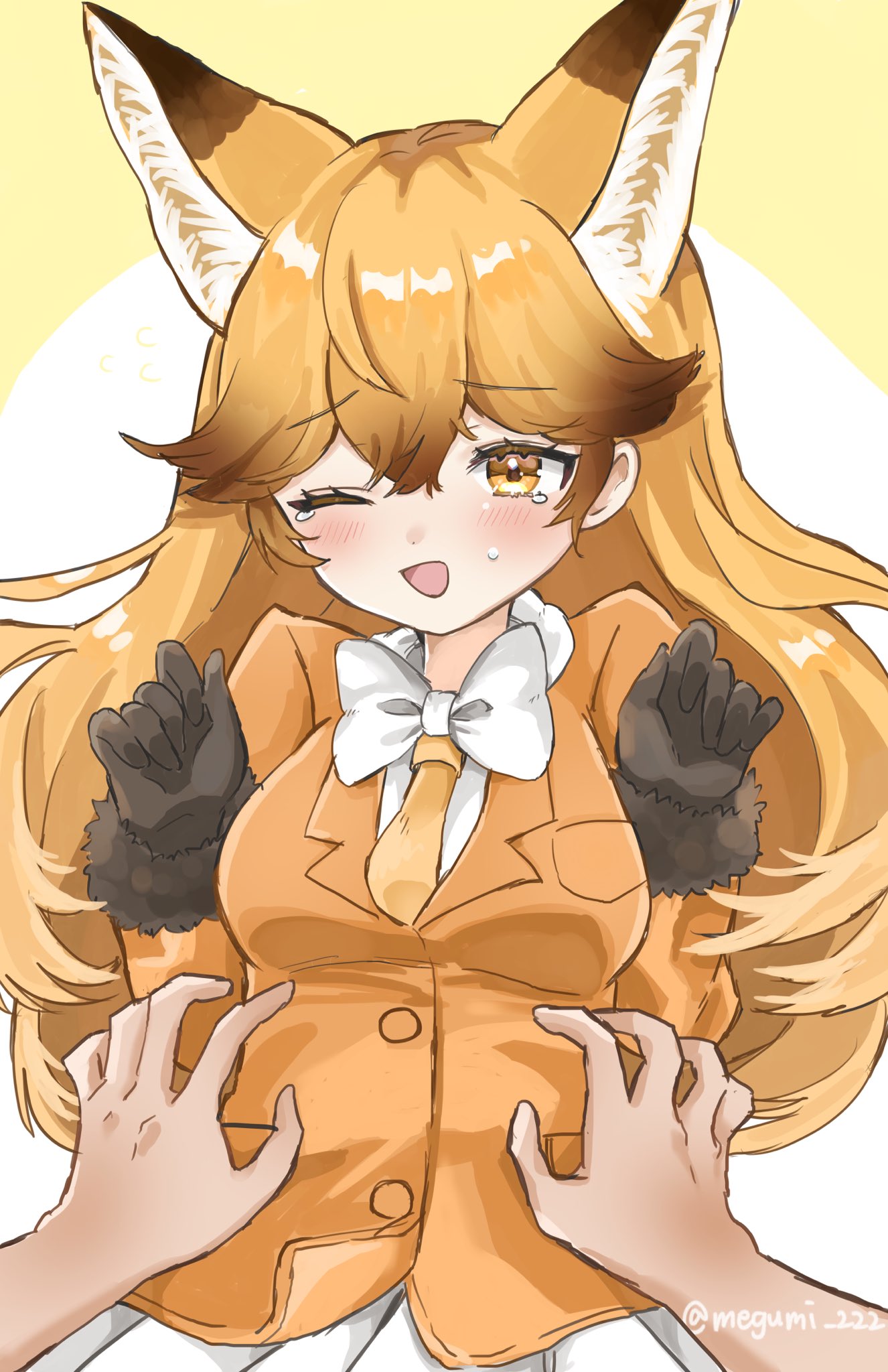 1girl animal_ears black_gloves blush bow bowtie commentary_request disembodied_hand extra_ears ezo_red_fox_(kemono_friends) fox_ears fox_girl fur_trim gloves hair_between_eyes highres jacket kemono_friends long_hair megumi_222 necktie one_eye_closed orange_hair orange_jacket orange_necktie pleated_skirt pov shirt skirt solo white_bow white_bowtie white_shirt white_skirt