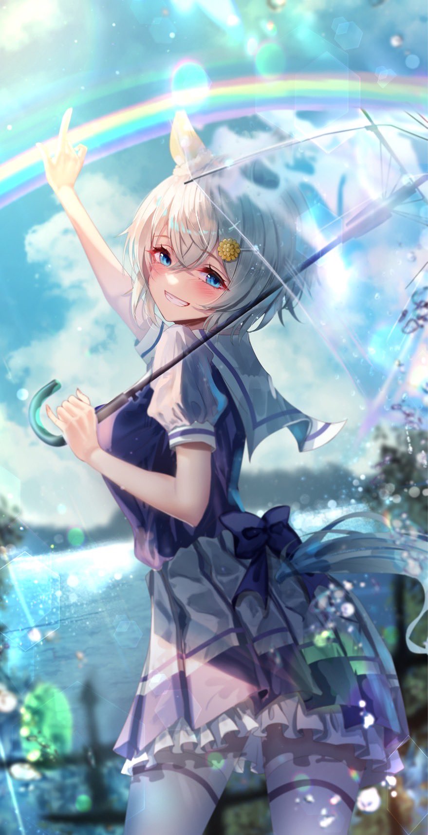 1girl animal_ears blue_eyes breasts chiachun0621 day grey_hair grin hair_ornament hairclip highres holding holding_umbrella horse_ears horse_girl horse_tail lens_flare looking_at_viewer looking_back medium_breasts outdoors pleated_skirt pointing pointing_up puffy_short_sleeves puffy_sleeves purple_shirt rainbow sailor_collar school_uniform seiun_sky_(umamusume) shirt short_hair short_sleeves skirt smile solo tail thighhighs tracen_school_uniform umamusume umbrella white_thighhighs