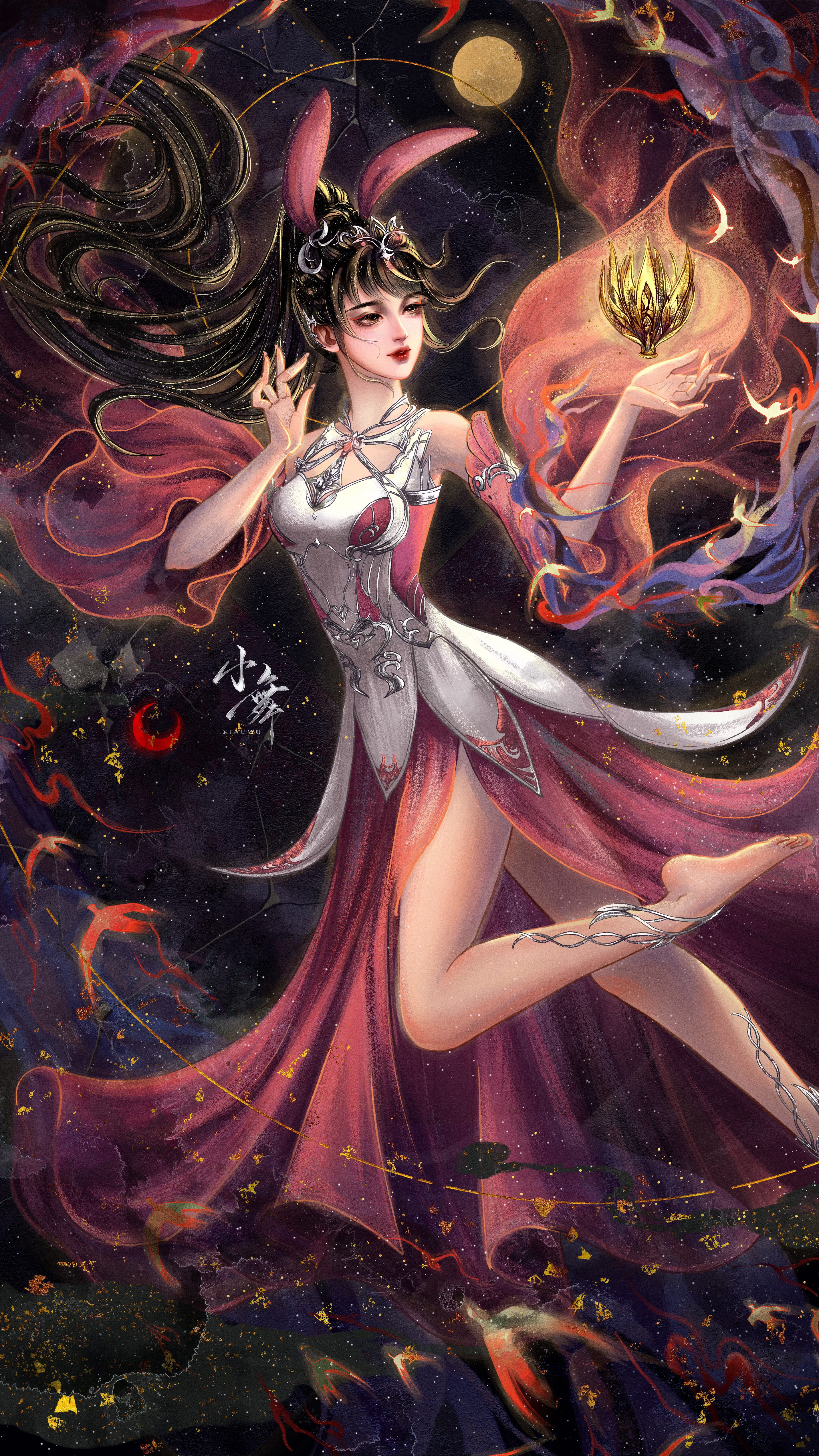 1girl absurdres barefoot black_hair clothing_cutout collar douluo_dalu dress floating full_body hair_ornament highres looking_to_the_side metal_collar moon night pink_dress ponytail sky solo xiang_chenshui_yu_milu_shenlin xiao_wu_(douluo_dalu)