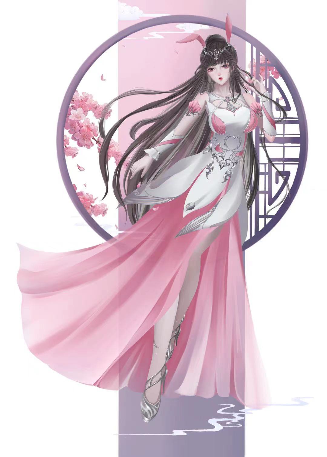 1girl animal_ears black_hair branch cherry_blossoms cleavage_cutout clothing_cutout douluo_dalu dress floating hair_ornament high_heels highres long_skirt pink_dress rabbit_ears round_window shi_xiao_tiantian_ya_zz skirt solo thighhighs window xiao_wu_(douluo_dalu)