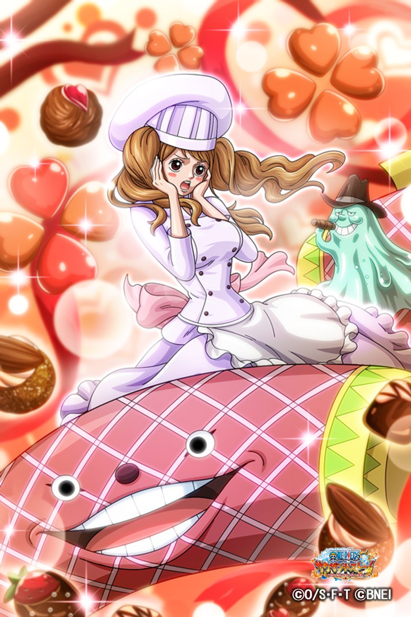 1girl 2others artist_request bare_legs blue_eyes blush breasts brown_hair charlotte_pudding chef chocolate cleavage copyright_name earrings embarrassed floating_hair hat highres homie_(one_piece) jewelry kneeling large_breasts lips logo long_hair looking_back looking_to_the_side multiple_others nitro_(one_piece) official_art one_piece one_piece:_treasure_cruise rabiyan_(one_piece) simple_background skirt third_eye twintails very_long_hair