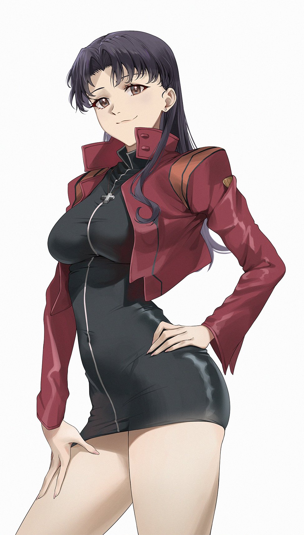 1girl bad_id bad_twitter_id bare_legs black_dress breasts brown_eyes covered_navel cropped_jacket cross cross_necklace dress earrings fingernails hand_on_lap hand_on_own_hip hand_on_own_leg hand_on_own_thigh highres impossible_clothes impossible_dress jacket jewelry katsuragi_misato large_breasts long_fingernails long_hair looking_at_another looking_at_viewer miniskirt necklace neon_genesis_evangelion purple_hair red_jacket ryudraw shiny_clothes short_dress skirt smile solo white_background