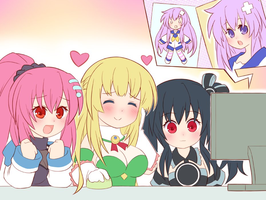 bare_shoulders black_hair blonde_hair braid breasts changyoushan collar computer dress hairband happy heart hood hoodie jacket large_breasts long_hair maho_(neptunia) medium_breasts nepgear neptune_(series) open_mouth orange_eyes pink_hair ponytail purple_eyes purple_hair red_eyes red_hair ribbon shirt small_breasts smile stuffed_toy surprised tank_top tsundere twintails two_side_up uni_(neptunia) vert vert_(neptunia) very_long_hair yamayama