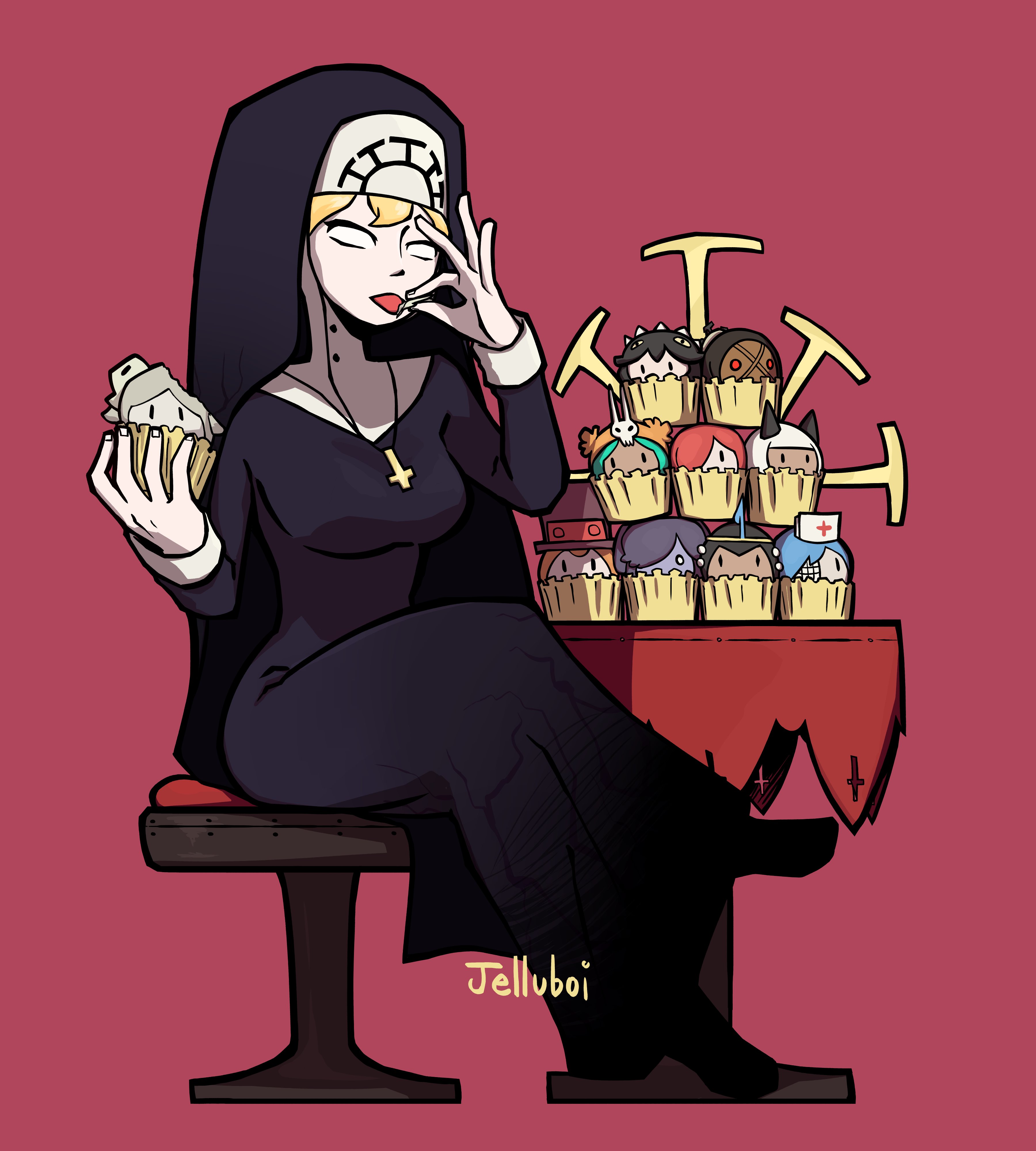 1girl absurdres blank_eyes cross cross_necklace crossed_legs cupcake double_(skullgirls) eating food habit highres holding jelluboi jewelry necklace nun open_mouth red_background sitting skullgirls solo stool table tablecloth tongue tongue_out white_eyes