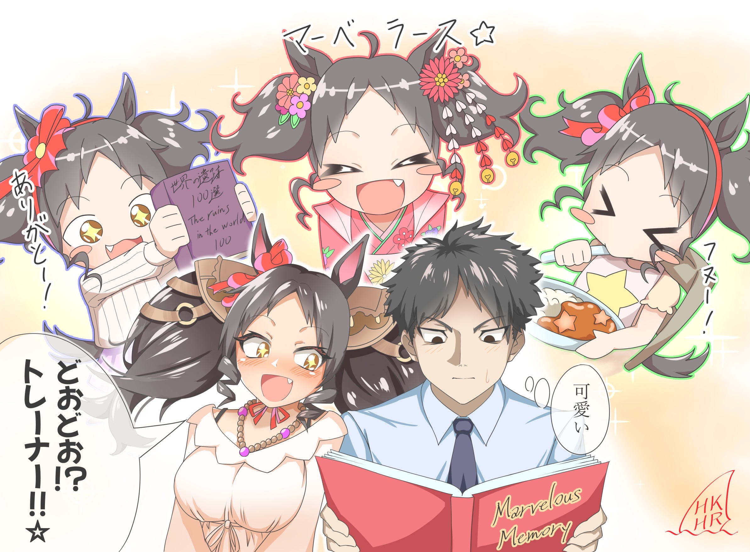 +_+ aged_down animal_ears black_hair blush blush_stickers book breasts child commentary curry curry_rice eating fang flower food hair_flower hair_ornament hekahire_isurus highres holding holding_book horse_ears horse_girl horse_tail japanese_clothes jewelry kimono large_breasts marvelous_sunday_(casual)_(umamusume) marvelous_sunday_(umamusume) necklace open_book orange_eyes rice tail translation_request twintails umamusume