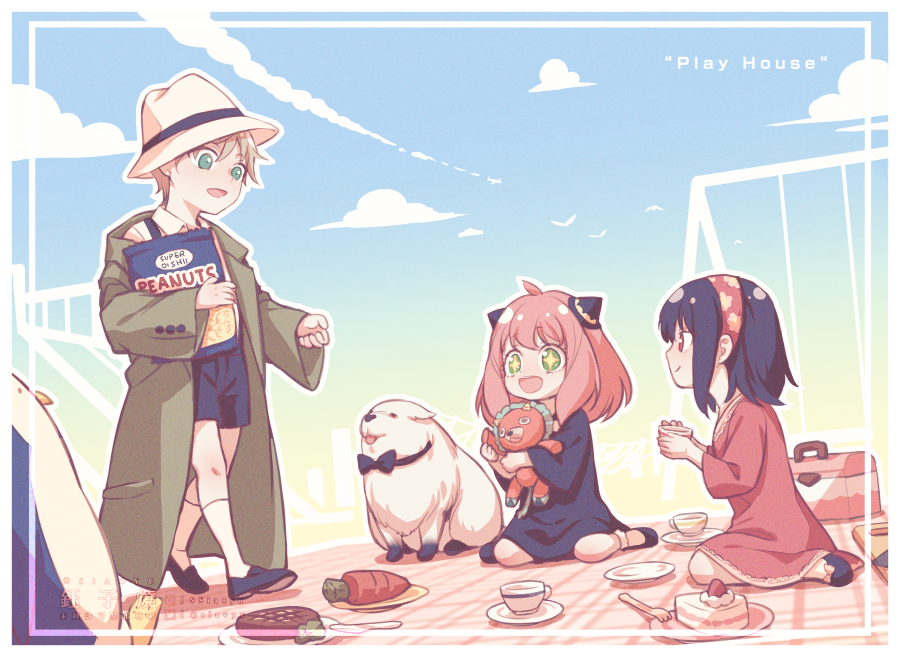 1boy 2girls :d aged_down animal anya_(spy_x_family) aqua_hair baby_animal bag black_dress black_hair black_pantyhose black_shoes black_shorts black_socks blanket blonde_hair blush bond_(spy_x_family) border bow bowtie box broccoli cake cake_slice carrot child closed_mouth clothed_animal coat collared_shirt cup cutting_board director_chimera_(spy_x_family) dog dress english_text food footwear_bow fork gradient_background great_pyrenees green_coat green_eyes hairband hands_up happy hat holding holding_bag holding_cup holding_food holding_stuffed_toy kitchen_knife kneehighs knife long_sleeves medium_hair multiple_girls open_mouth oversized_clothes pantyhose peanut picnic picnic_basket pink_hair plaid_blanket playing profile puppy red_dress red_eyes saucer shirt shoes short_hair shorts siaoyu sidelocks sitting smile snake socks sparkling_eyes spy_x_family steak stuffed_animal stuffed_penguin stuffed_toy suspender_shorts suspenders teacup time_paradox tongue tongue_out toy twilight_(spy_x_family) walking wariza white_hat white_shirt yor_briar