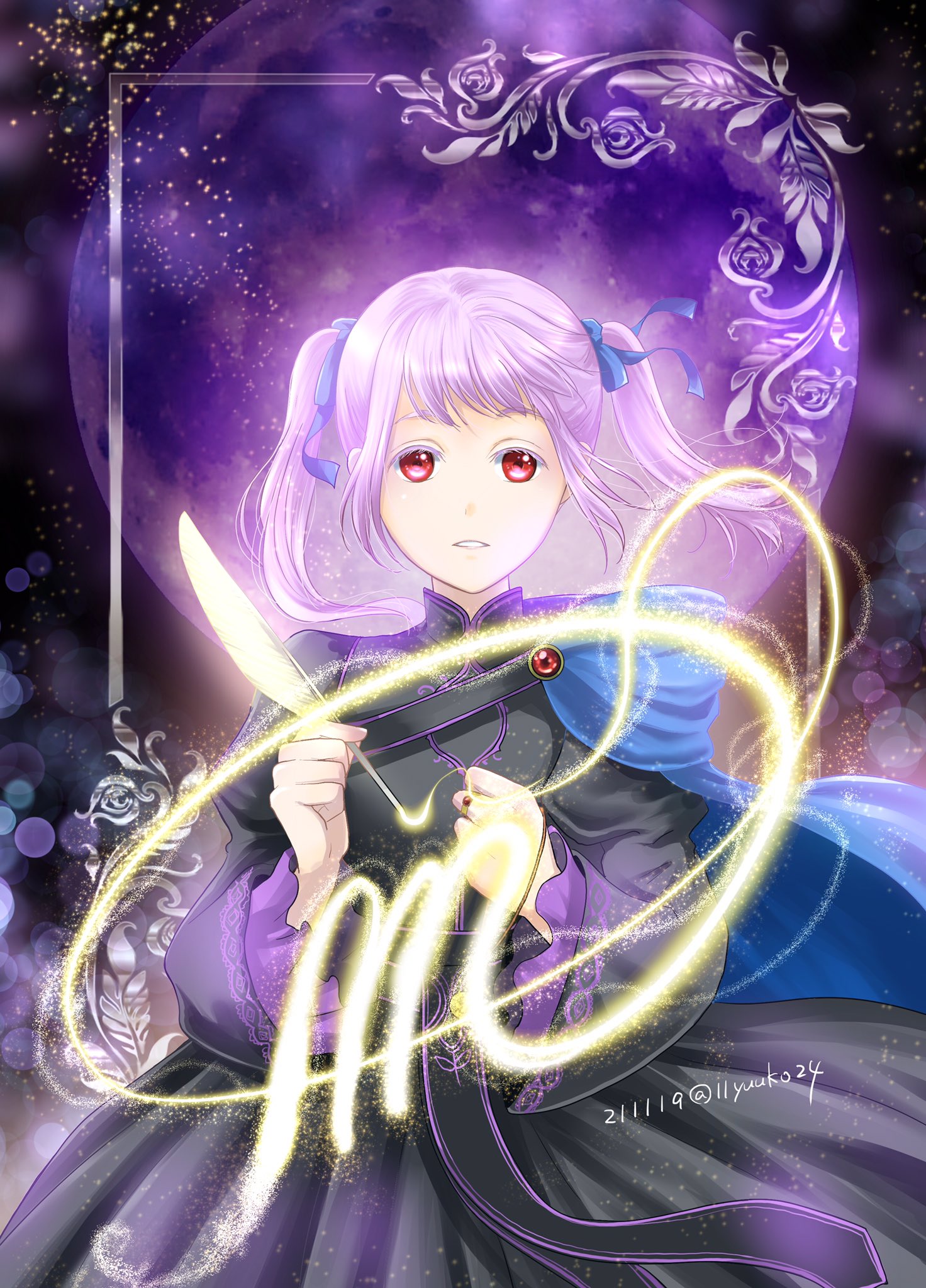 1girl black_dress blue_ribbon colored_eyelashes dated dress floating_hair full_moon hair_ribbon hannelore_(honzuki_no_gekokujou) highres honzuki_no_gekokujou layered_sleeves long_hair long_sleeves looking_at_viewer moon parted_lips pink_hair purple_moon red_eyes ribbon side_cape solo twintails twitter_username yuuko24