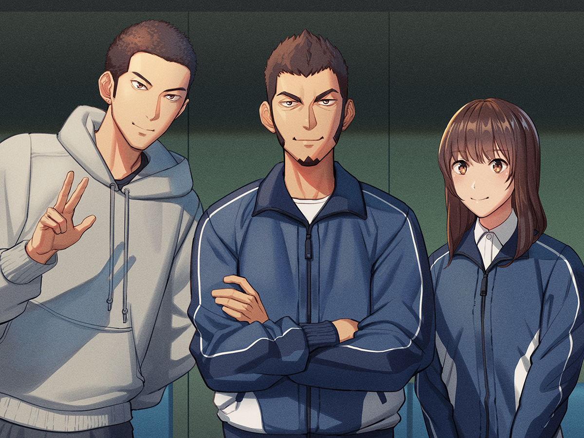 1girl 2boys arm_behind_back beard brown_eyes brown_hair buzz_cut crew_cut crossed_arms facial_hair grey_hoodie hood hoodie jacket leaning_to_the_side mature_male multiple_boys original sanpaku short_hair sideburns tettabuzz track_jacket v v_arms very_short_hair wrinkled_skin