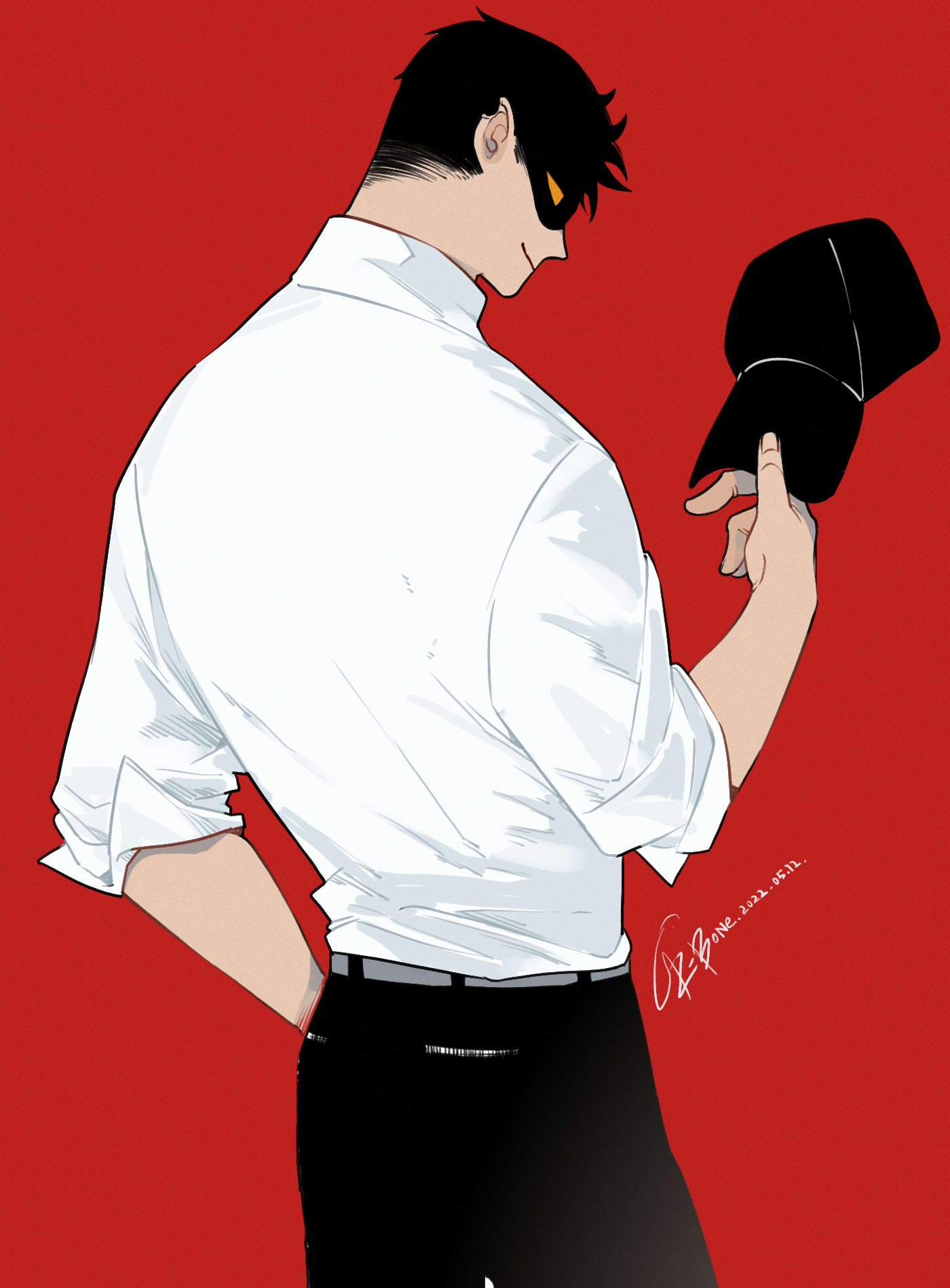 1boy 2022 artist_name baseball_cap black_hair black_hat black_pants cowboy_shot dated eyes_in_shadow hat highres holding holding_unworn_clothes holding_unworn_hat k-bone looking_back male_focus no_pupils original pants red_background shirt short_hair signature sleeves_pushed_up smile solo unworn_hat unworn_headwear very_short_hair white_shirt yellow_eyes
