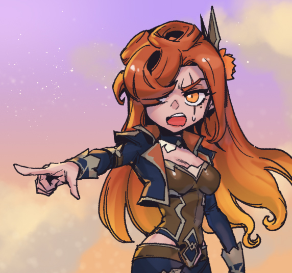 1girl black_jacket black_pants breasts brown_vest cleavage clothing_cutout cropped_jacket hair_over_one_eye high_noon_katarina hip_vent jacket katarina_(league_of_legends) league_of_legends long_hair long_sleeves medium_breasts official_alternate_costume open_mouth orange_eyes orange_hair outdoors pants phantom_cross pointing scar scar_across_eye scar_on_face sky slit_pupils solo sweatdrop teeth upper_teeth_only vest