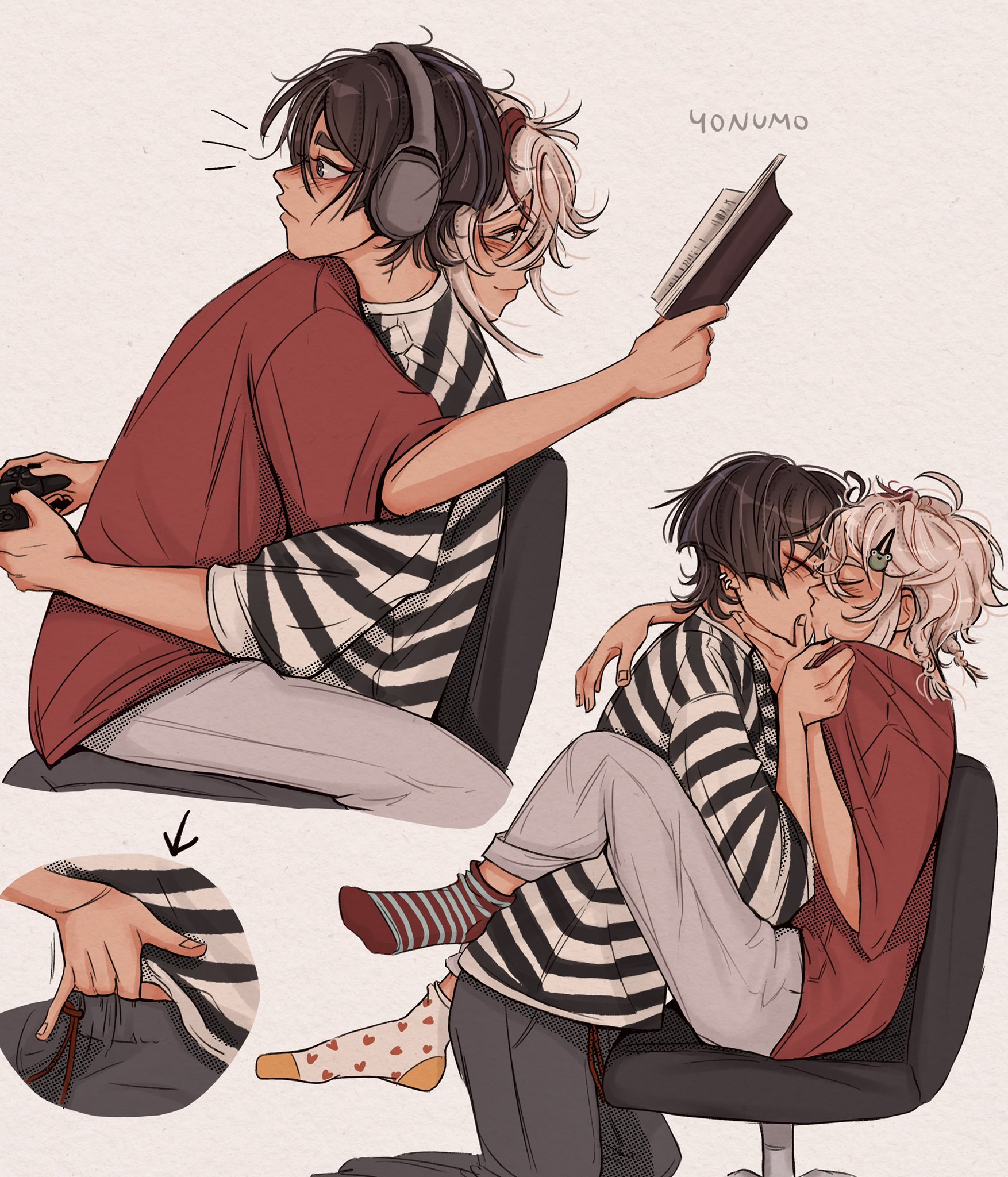 2boys asymmetrical_legwear black_hair book ear_piercing earphones eyeliner french_kiss genshin_impact hair_ornament hairclip highres holding holding_book kaedehara_kazuha kiss low_ponytail makeup male_focus multicolored_hair multiple_boys open_book piercing ponytail red_eyeliner red_hair scaramouche_(genshin_impact) shirt short_hair short_sleeves smile streaked_hair striped_clothes striped_shirt white_hair yaoi yonumo