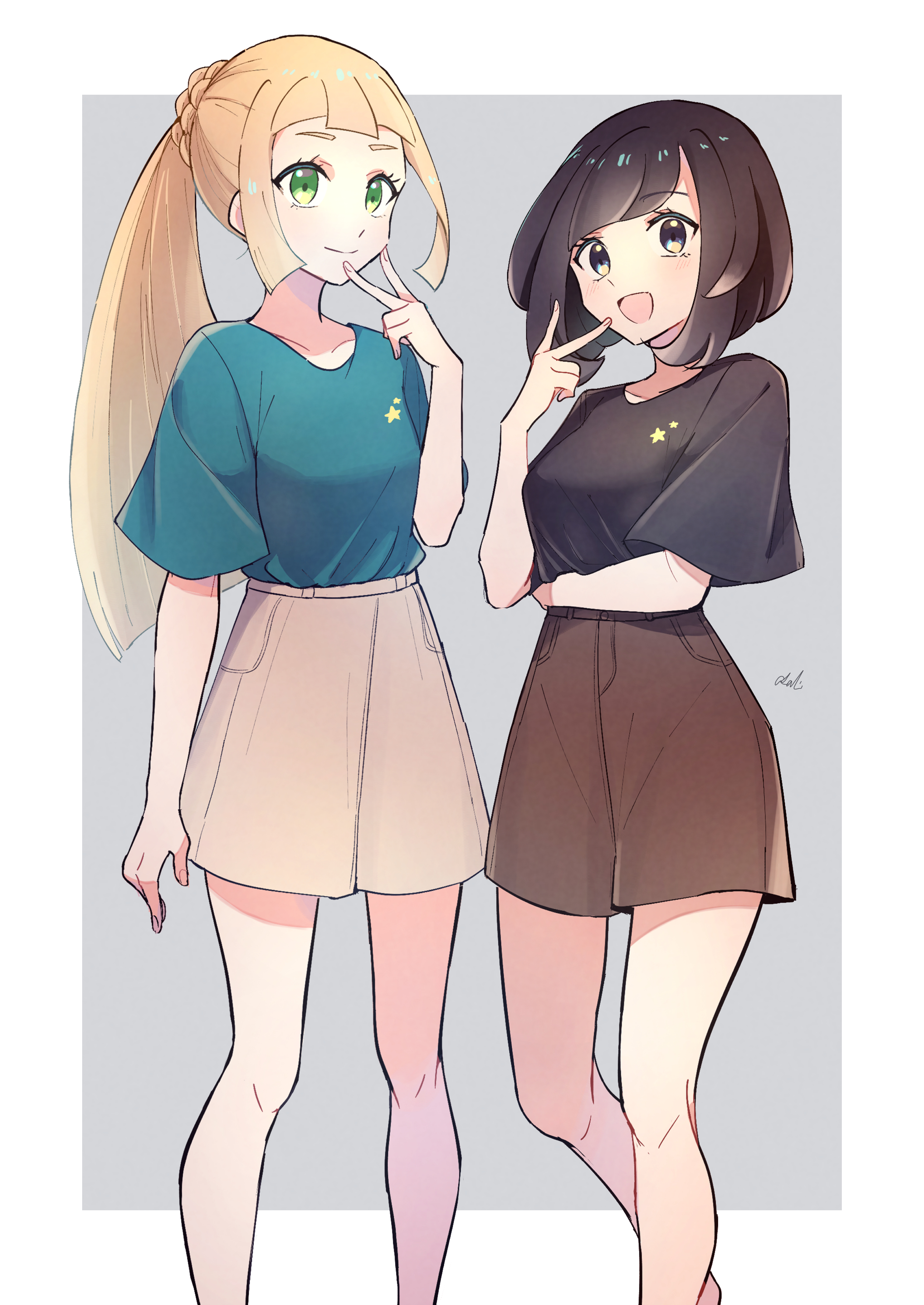 2girls :d absurdres alternate_costume blonde_hair blunt_bangs border brown_hair brown_shorts closed_mouth collarbone eyelashes green_eyes green_shirt grey_background hand_up highres knees lillie_(pokemon) long_hair multiple_girls nintendo open_mouth pokemon pokemon_sun_and_moon ponytail selene_(pokemon) shirt short_sleeves shorts signature smile tere_asahi v white_border