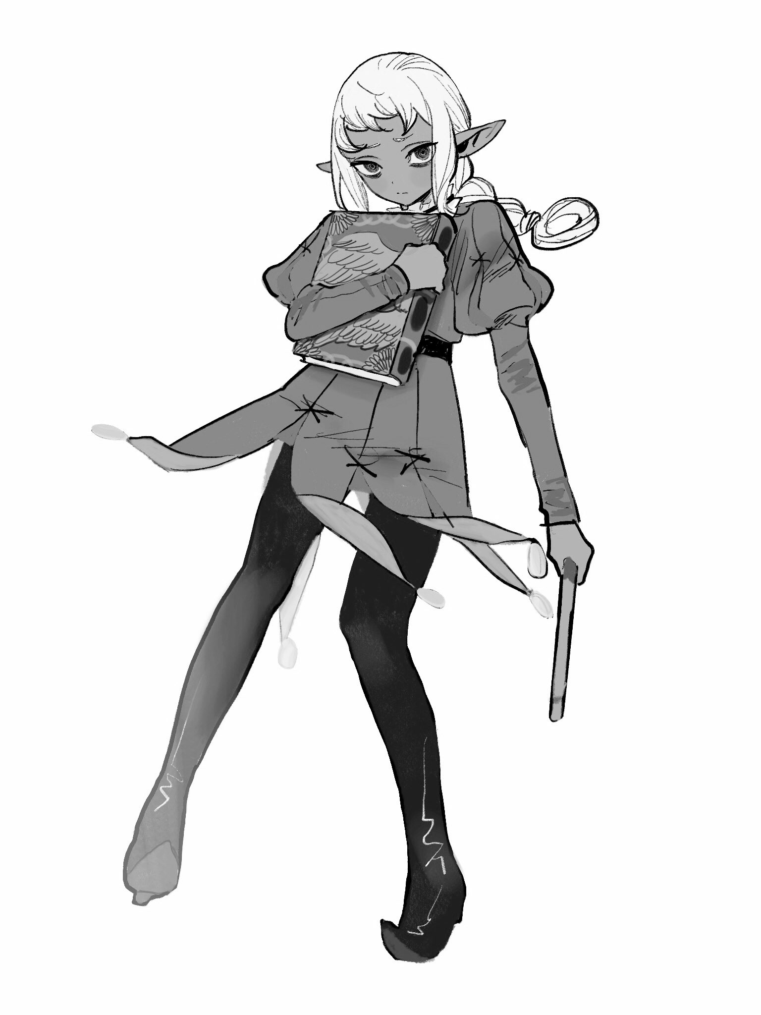 1boy bags_under_eyes belt book braid braided_ponytail closed_mouth coin_(ornament) dark-skinned_male dark_skin dungeon_meshi elf frills frown frs2 full_body greyscale hair_rings highres holding holding_book holding_wand jester juliet_sleeves long_hair long_sleeves looking_at_viewer male_focus monochrome petite pointy_boots pointy_ears puffy_sleeves sidelocks simple_background single_braid solo thistle_(dungeon_meshi) tunic wand