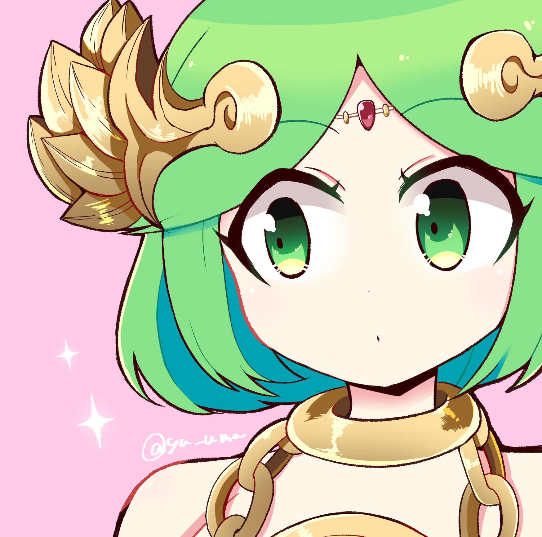 1girl alternate_hairstyle ancient_greek_clothes bare_shoulders chiton dot_nose eyelashes forehead_jewel green_eyes green_hair hair_ornament highres jewelry kid_icarus kid_icarus_uprising necklace nintendo palutena pink_background short_hair sparkle twitter_username upper_body yu_makoto_(yu_uma)