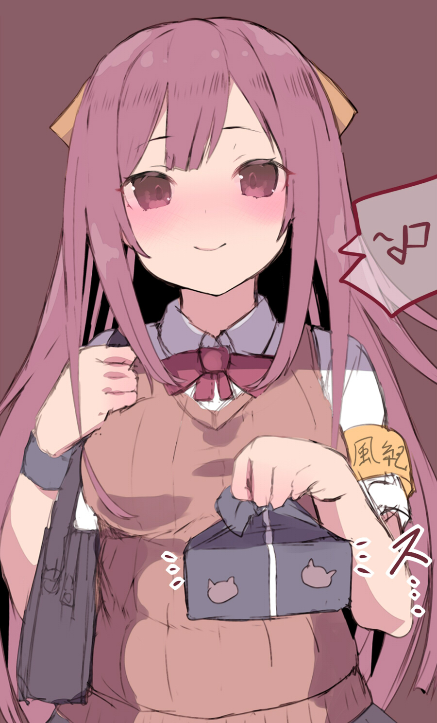 1girl alternate_costume armband atsutoku bag bento blush bow breasts brown_background cowboy_shot gradient_hair hair_between_eyes hair_bow highres kamikaze_(kancolle) kantai_collection long_hair multicolored_hair music pink_hair purple_eyes purple_hair ribbon school_bag school_uniform shirt short_sleeves singing small_breasts solo vest white_shirt yellow_bow yellow_ribbon