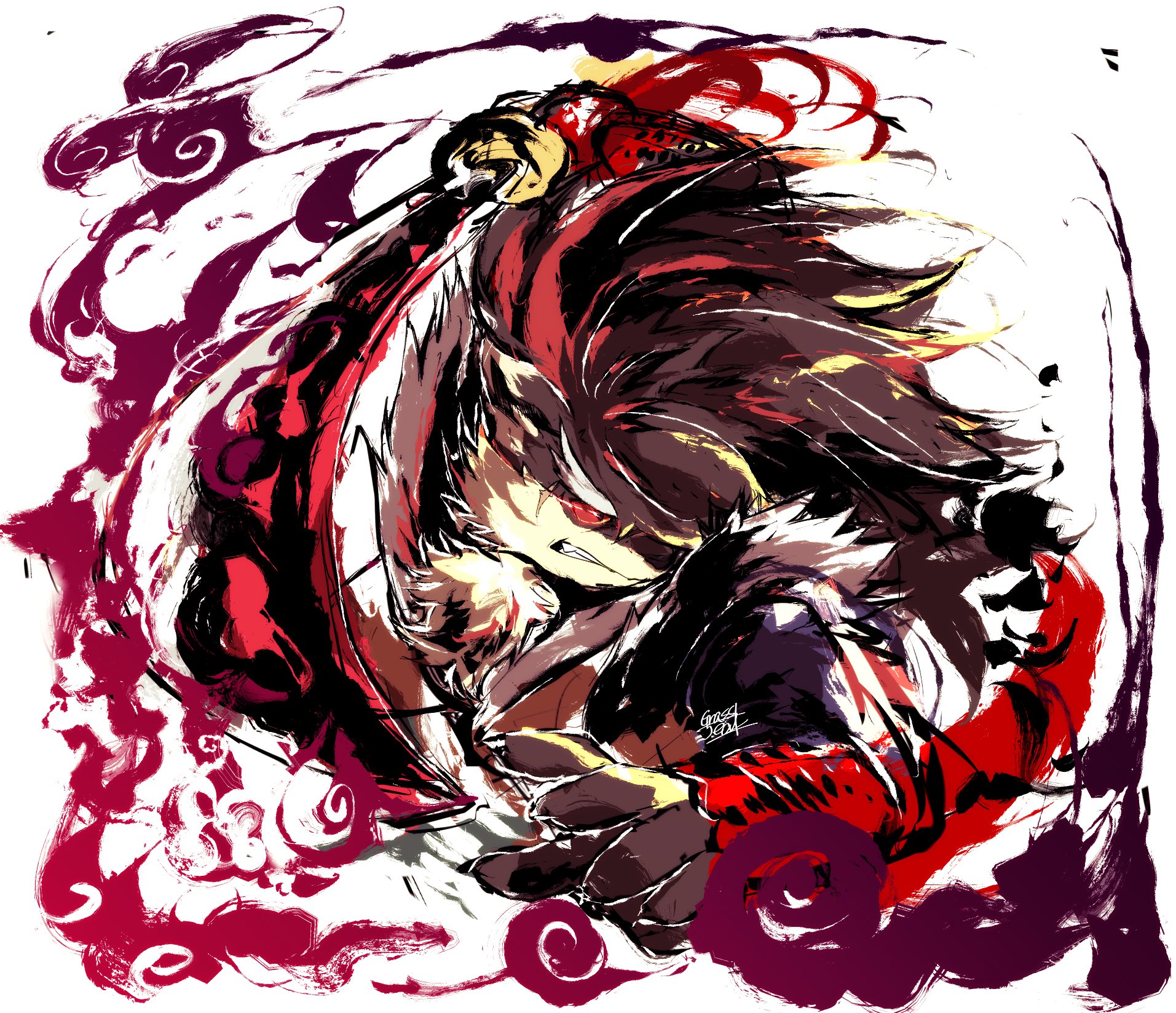 1boy animal_ears armor black_hair brown_hair colored_sclera commentary_request dog_boy dog_ears fighting_stance fire furry furry_male grassjeak highres holding holding_sword holding_weapon japanese_armor japanese_clothes kote male_focus ponytail red_sclera scar scar_on_face shino_(housamo) signature solo sword tokyo_houkago_summoners upper_body weapon white_background