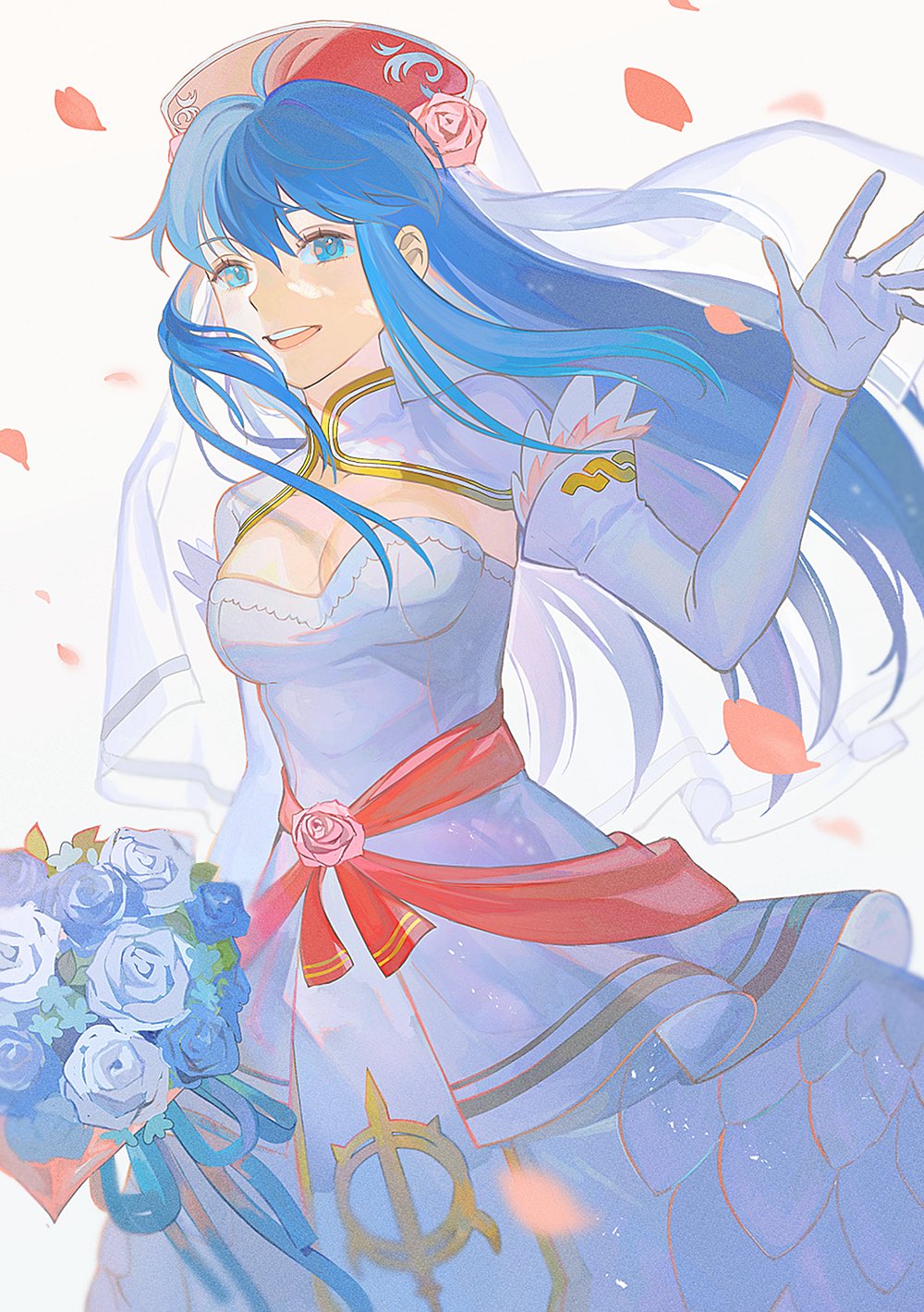 1girl bare_shoulders blue_eyes blue_hair blush breasts bride cleavage closed_mouth dress elbow_gloves fire_emblem fire_emblem:_the_binding_blade fire_emblem_heroes flower gloves hair_ornament hat headband highres jewelry kyufe lilina_(bridal)_(fire_emblem) lilina_(fire_emblem) long_hair looking_at_viewer nintendo official_alternate_costume simple_background smile solo wedding_dress white_dress